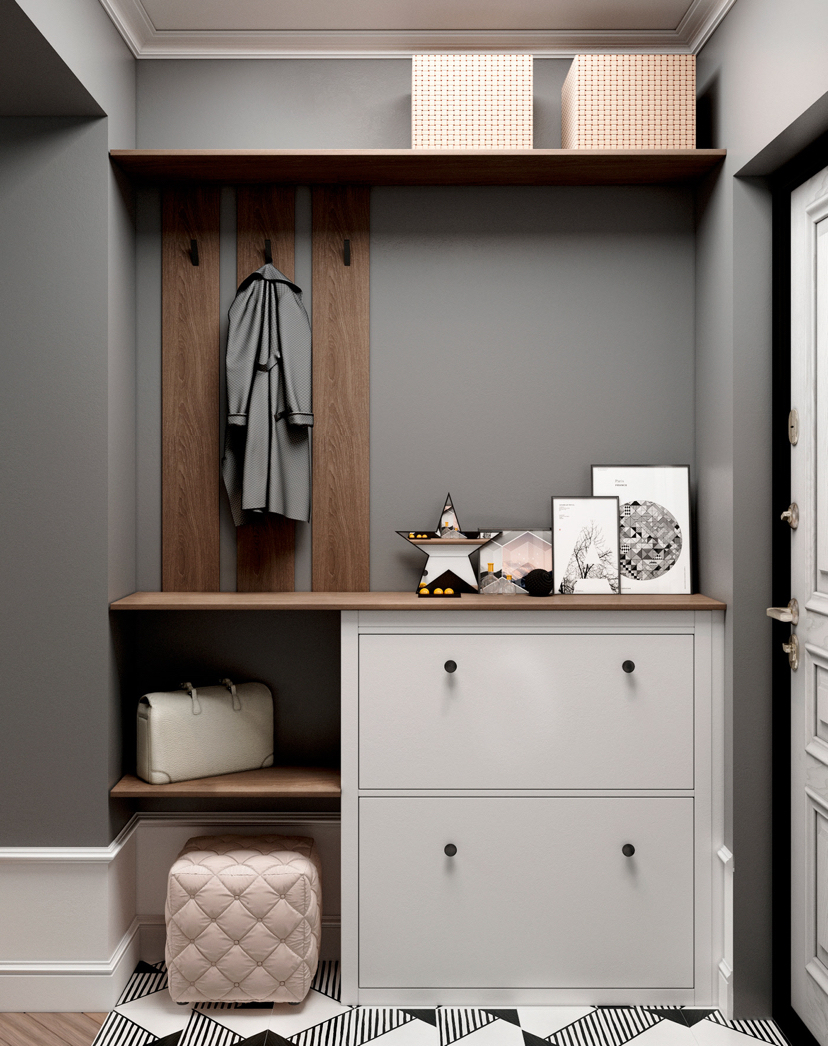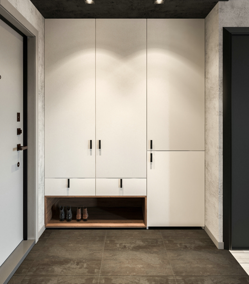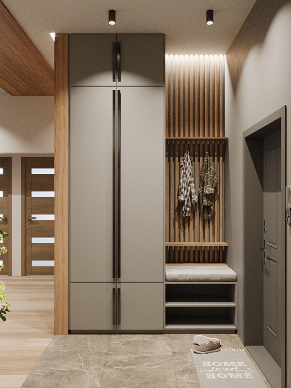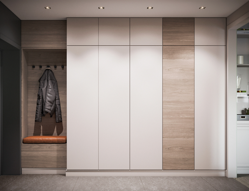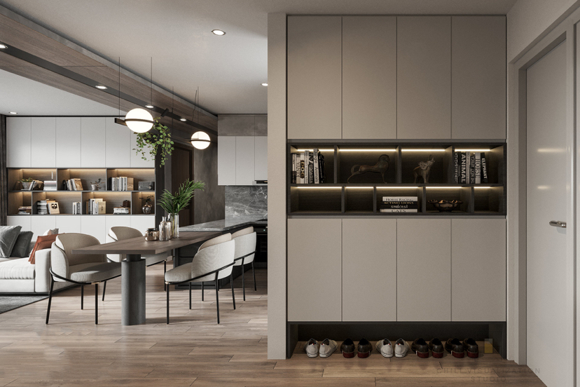 鞋柜+收纳是最常见的玄关柜组合形式,以掩门、磁吸等全封闭式的设计为主,适合玄关处狭窄的户型,提升空间的整洁感,视觉上放大该空间区域。
