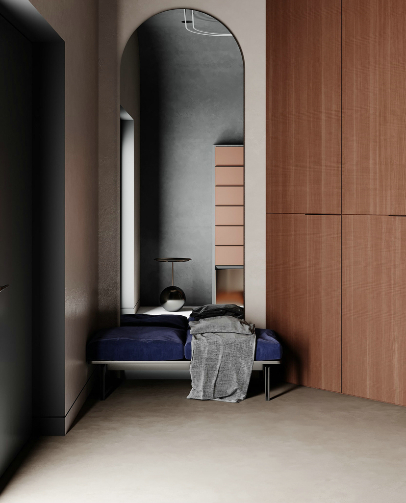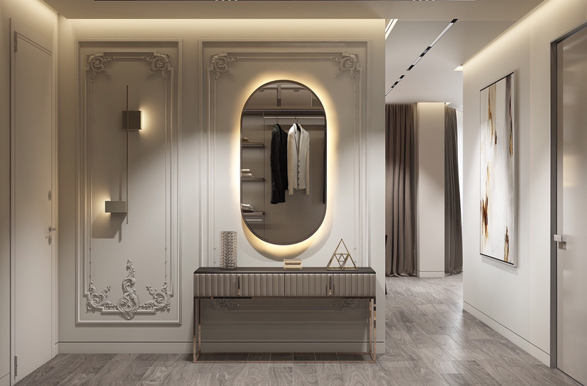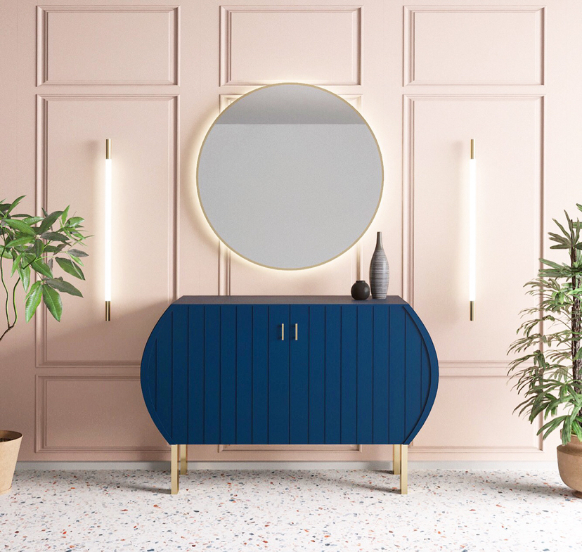 一个精致的装饰柜、一面干净的镜子,再灯光的点缀下,营造出一种高品质的生活场景,不仅提升了家居空间的格调,同时也是日常生活中的一种视觉享受。