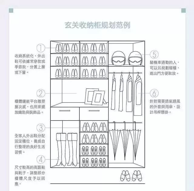 2、鞋柜的高度设计在15公分左右,因为一般女主人都有高跟鞋或靴子,一定要预留高度比较高可以放高跟鞋的区域。