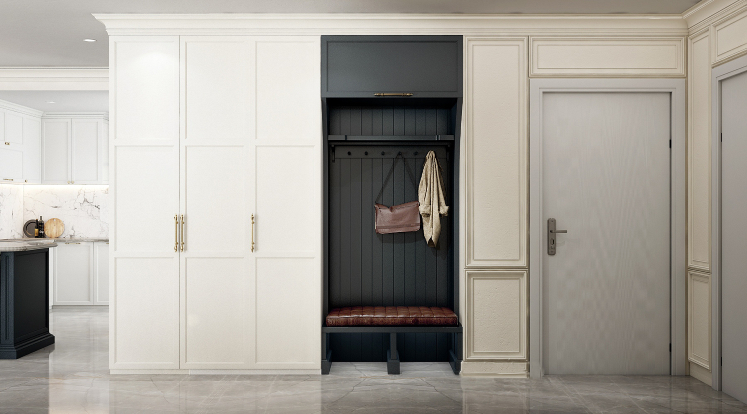 随着时代的发展,人们越来越多的注重“以人为本”的设计理念,一切从功能的实用性与设计的观赏性出发。玄关卡座的设计是一种非常有创造力的做法,将换鞋凳融入壁柜当中直接省去了鞋凳空间,更是符合人们的生活习惯。