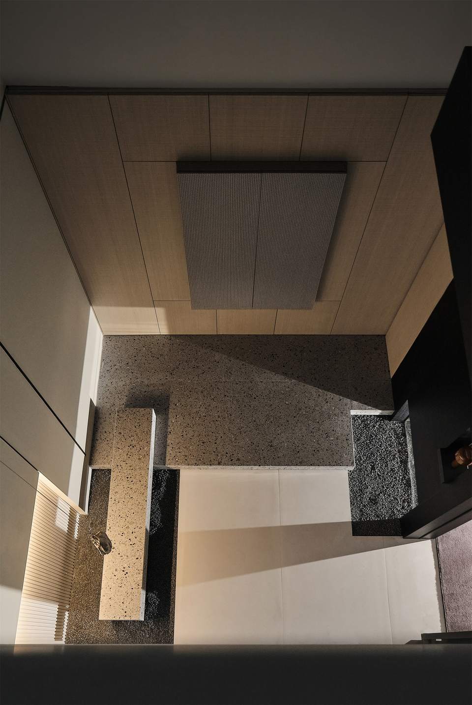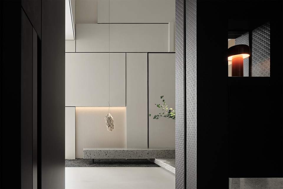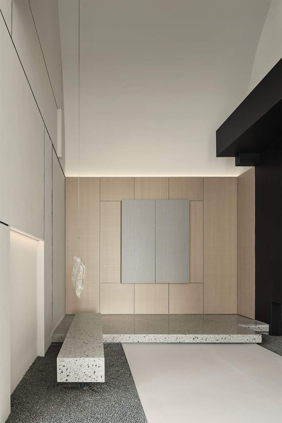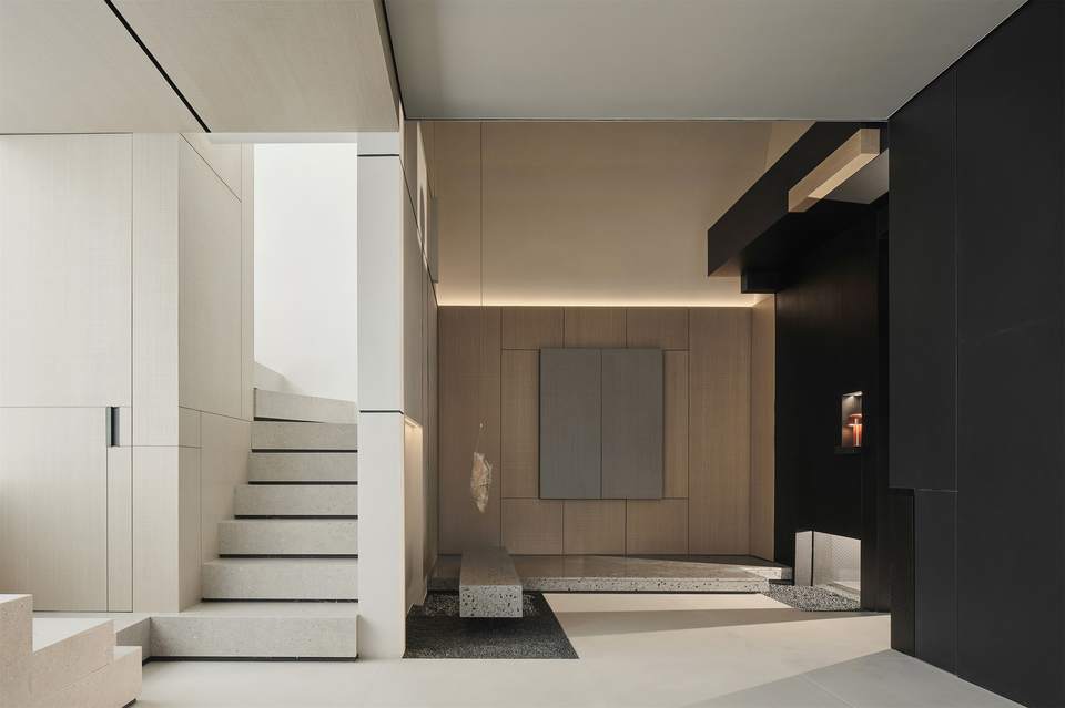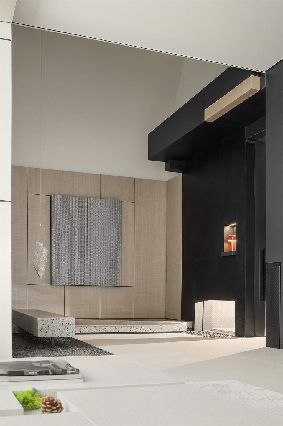 比起门口神秘的黑,入户处温润的浅米色带来的自由洋溢,在原石与灯光的点缀之下,更加明朗和谐,给人以十分柔和宁静的动态感觉,同时这个空间被用作接待客户专用。