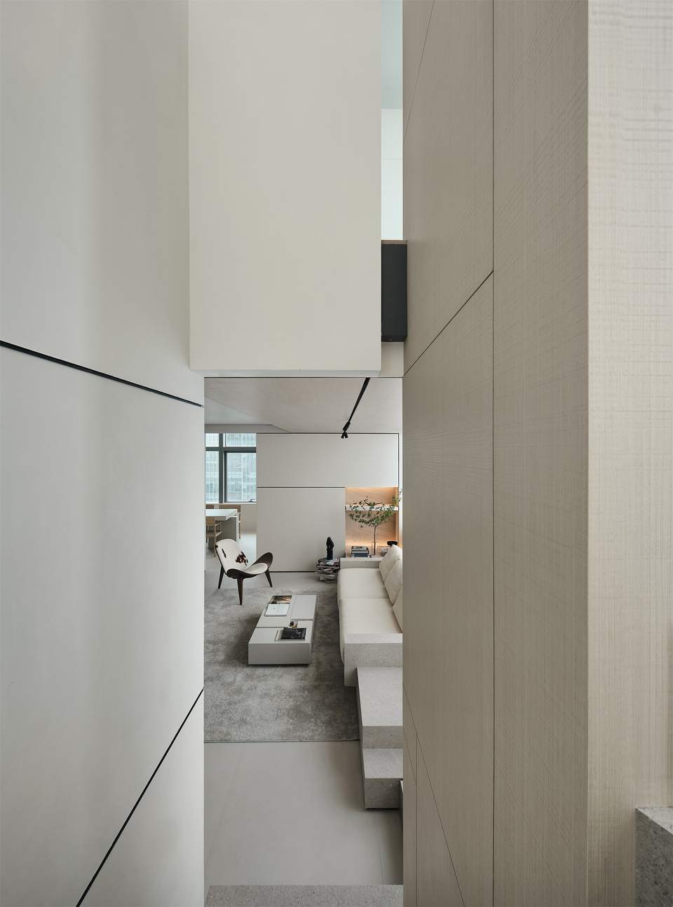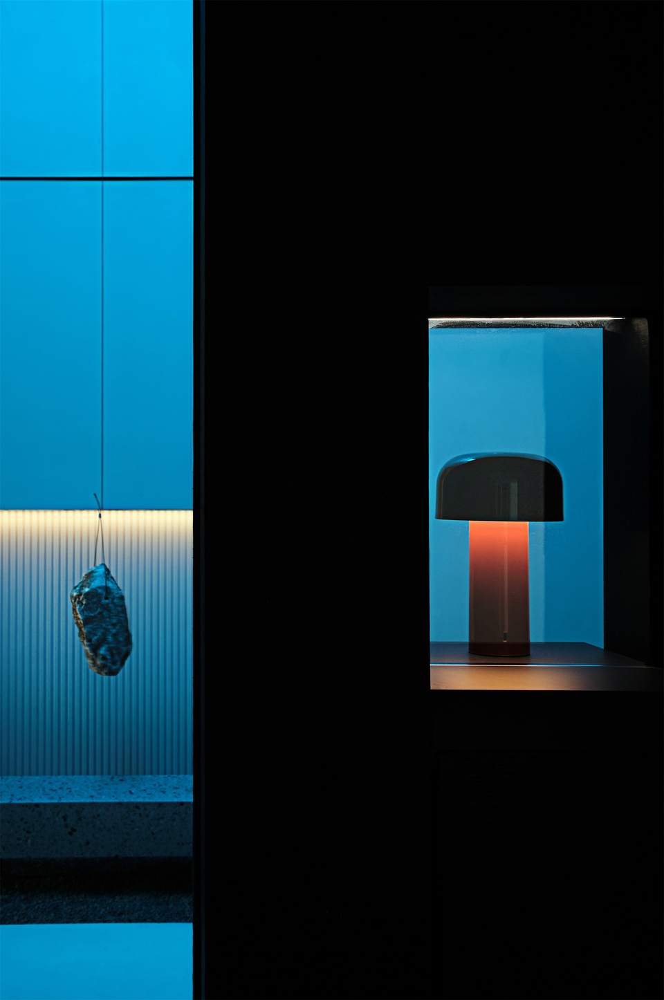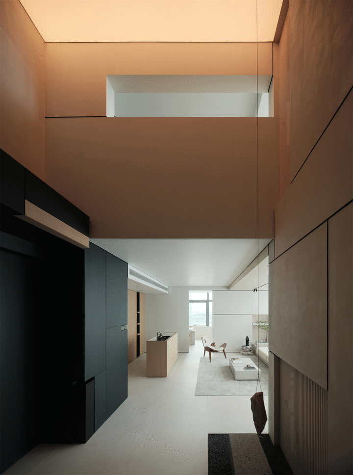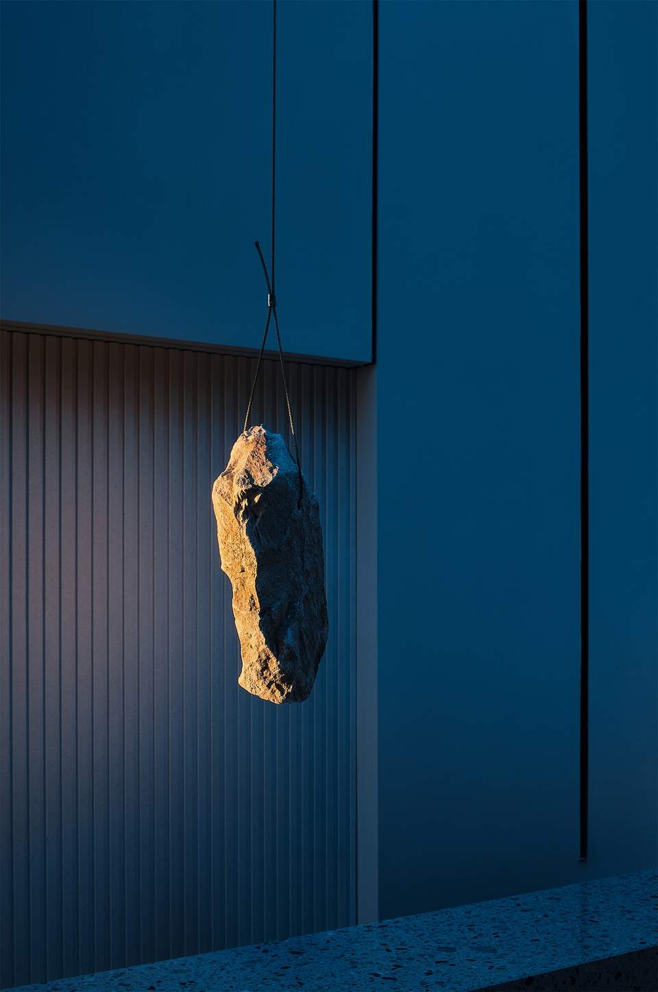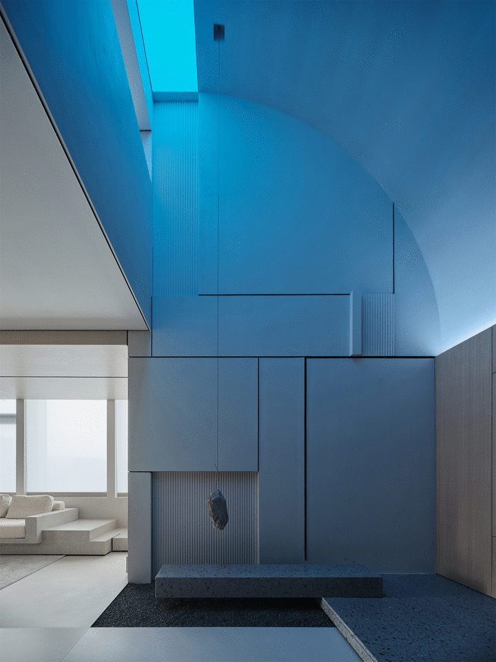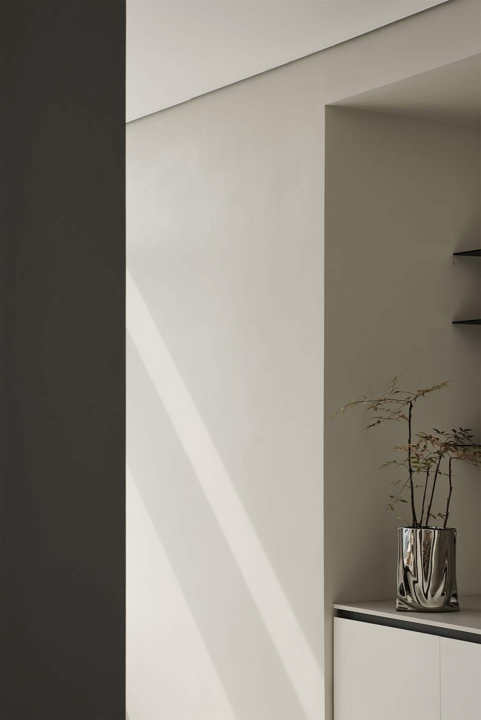 比起门口神秘的黑,入户处温润的浅米色带来的自由洋溢,在原石与灯光的点缀之下,更加明朗和谐,给人以十分柔和宁静的动态感觉,同时这个空间被用作接待客户专用。