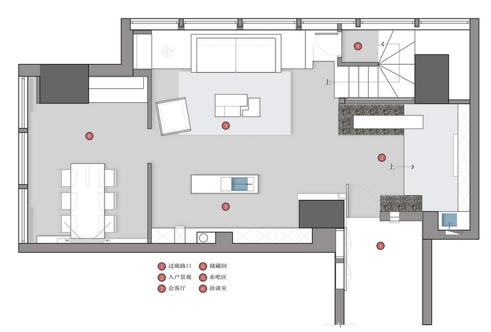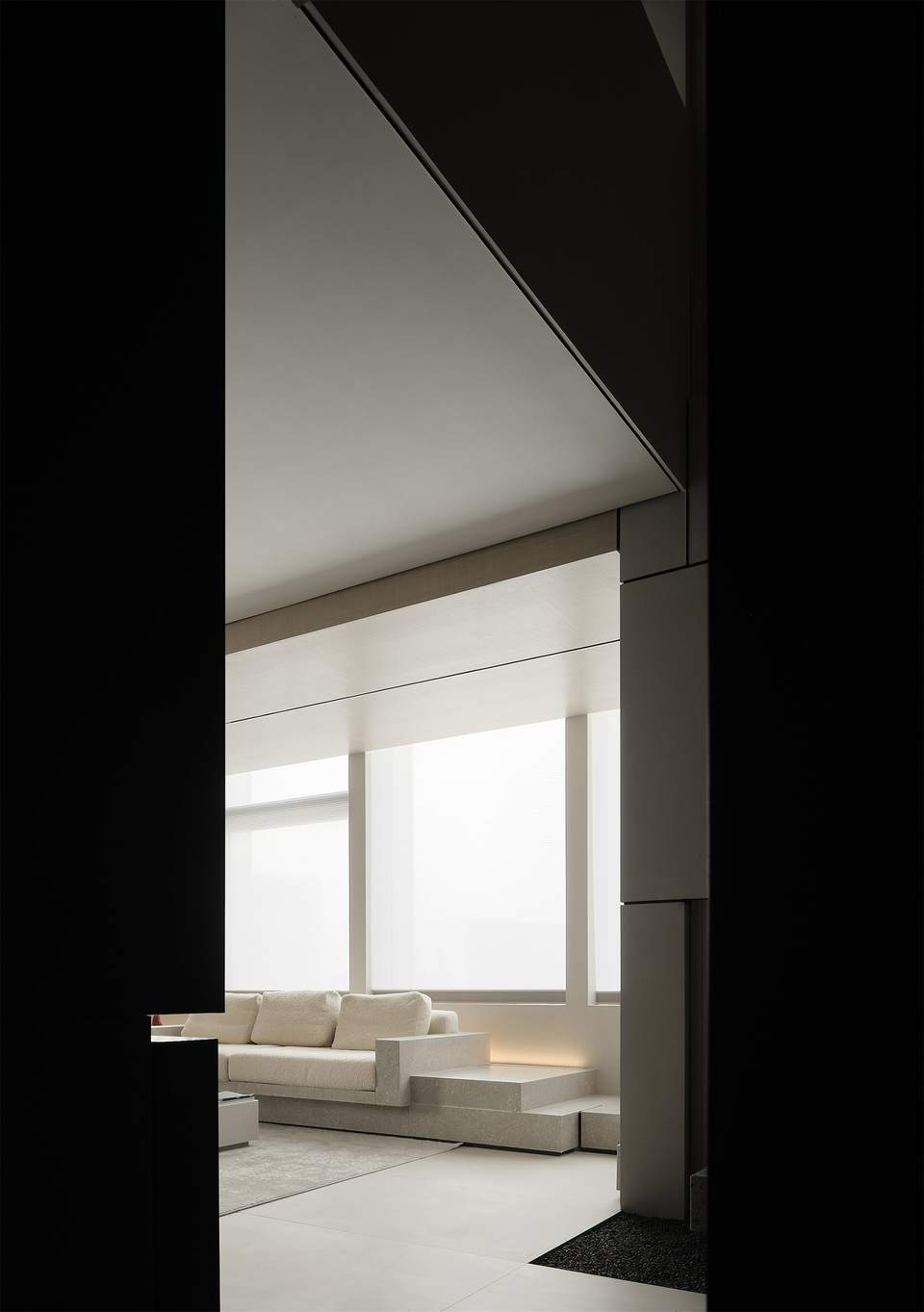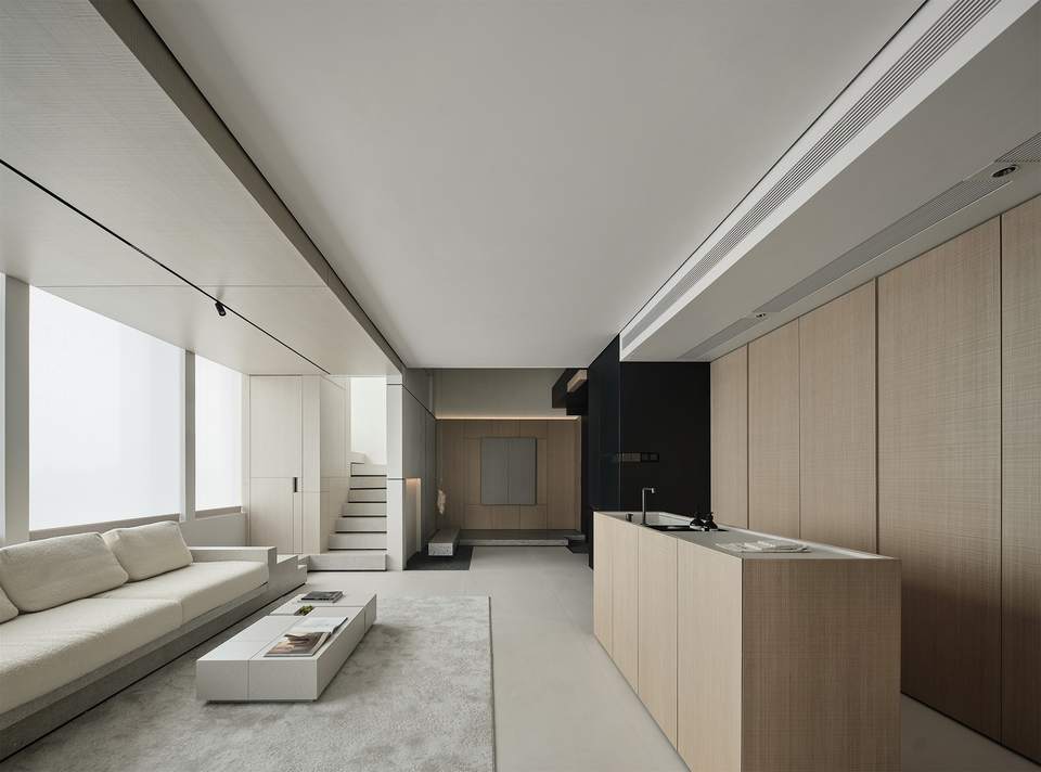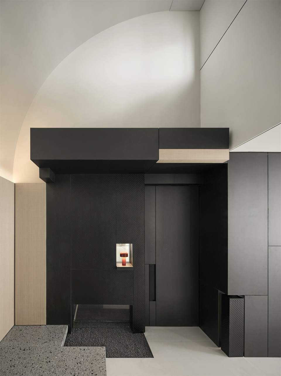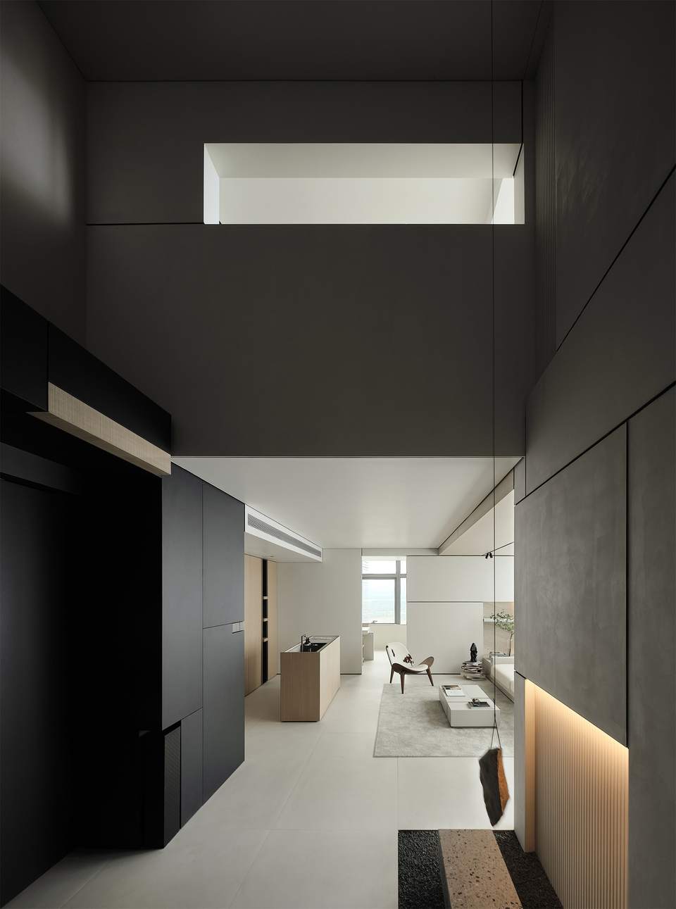 比起门口神秘的黑,入户处温润的浅米色带来的自由洋溢,在原石与灯光的点缀之下,更加明朗和谐,给人以十分柔和宁静的动态感觉,同时这个空间被用作接待客户专用。
