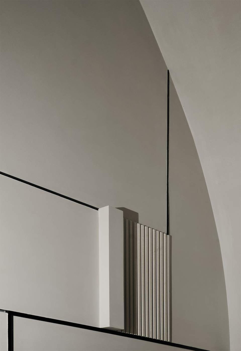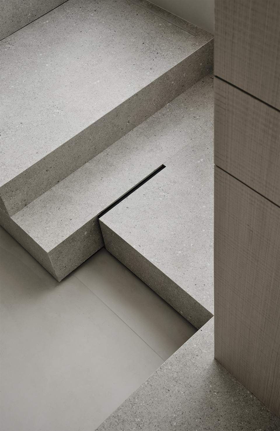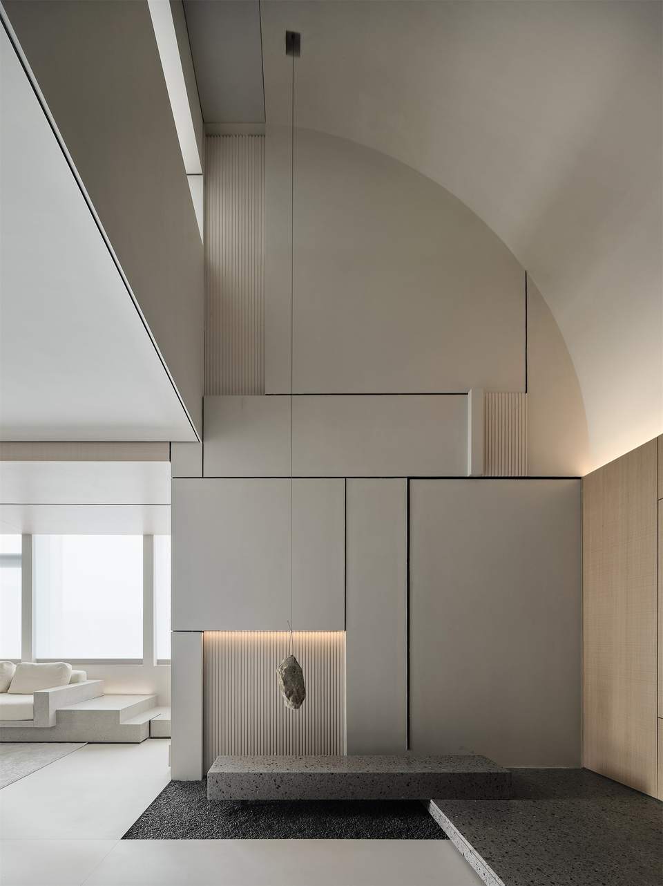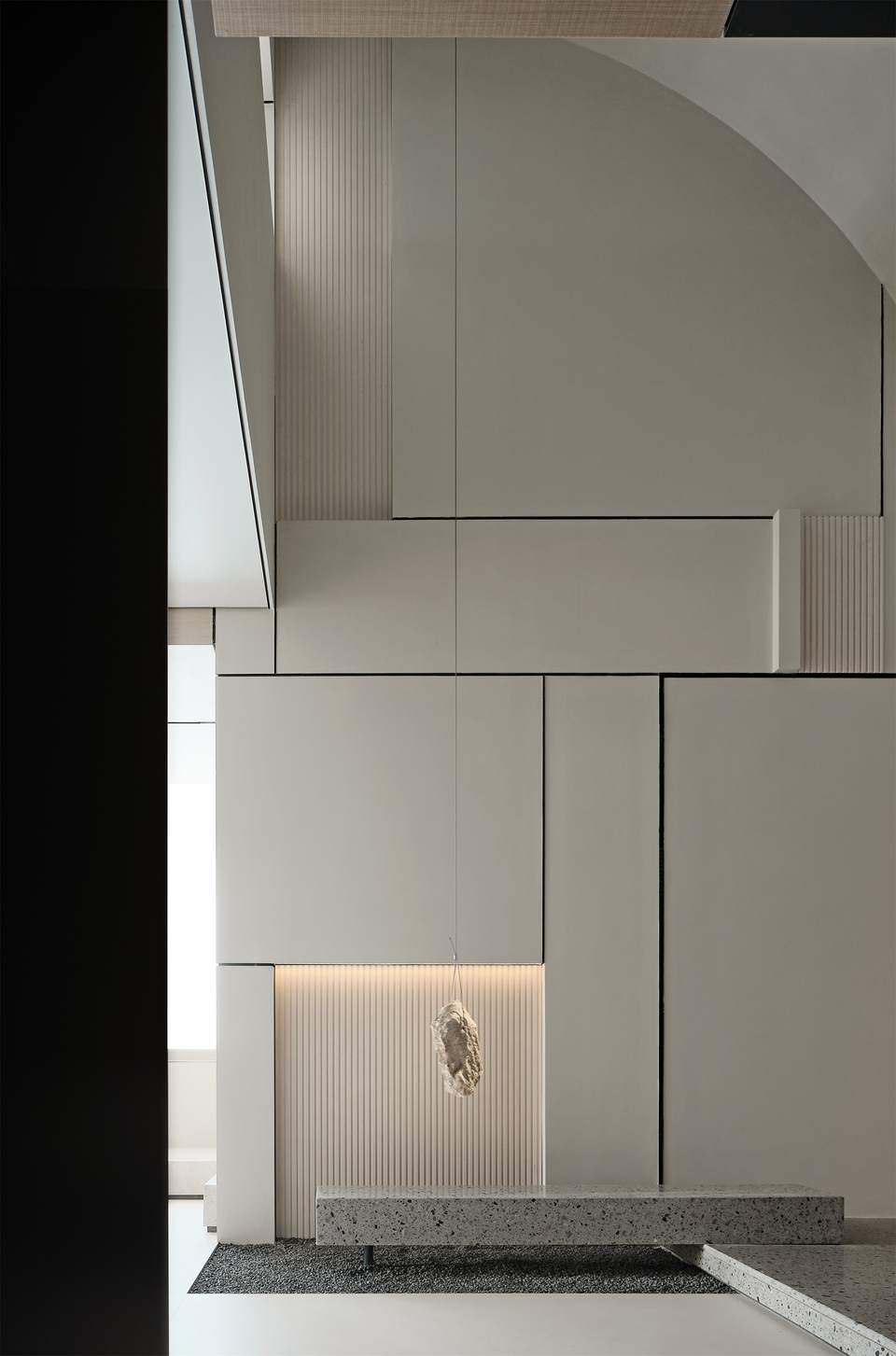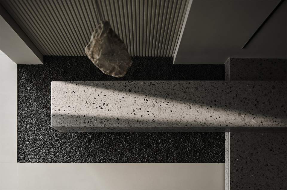 将如此温和的特性赋予其无穷的包容性,配合立体的抽槽面莱姆石以及顶面半弧形带来的感性,曲直相衬,与原木色,灰色水磨石这些自然的元素带来的舒适感,丰富的纹理感将继续延续,得以感性、纯真的表达。