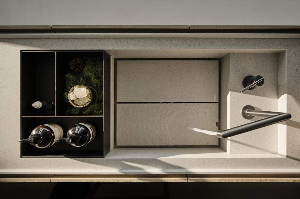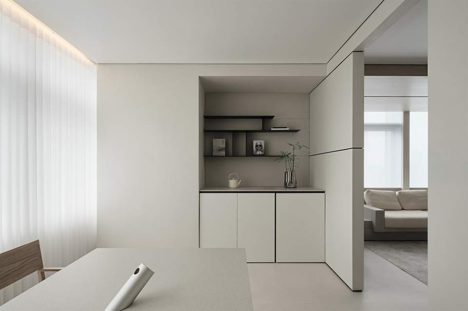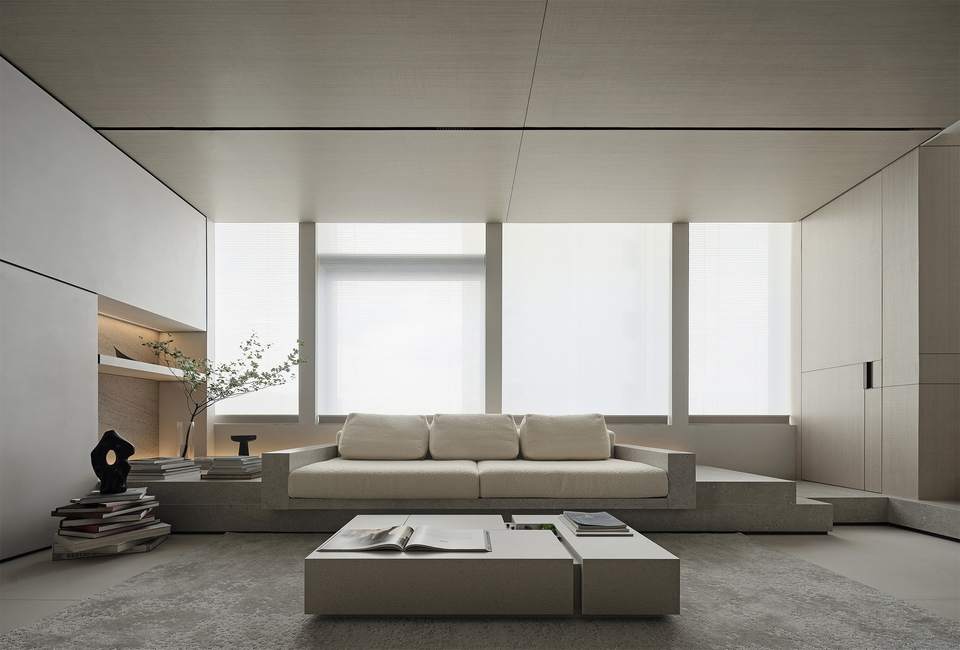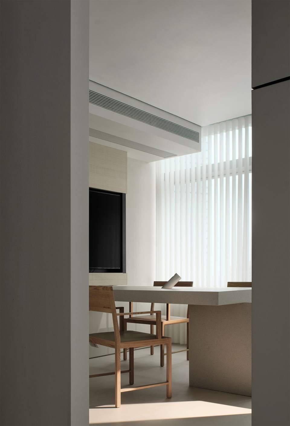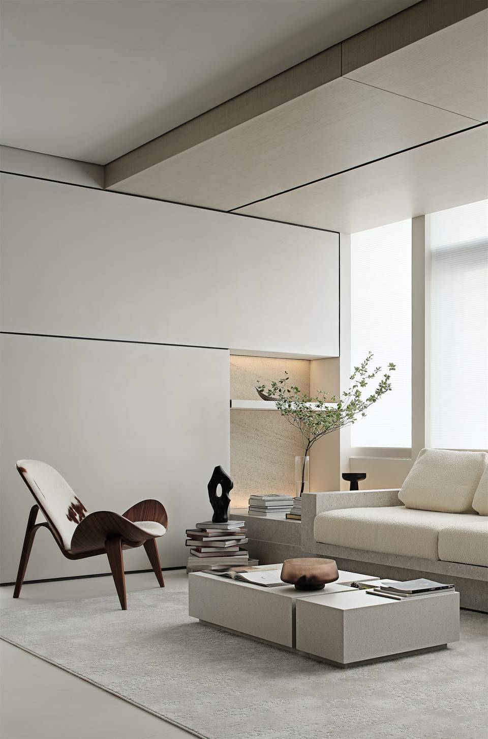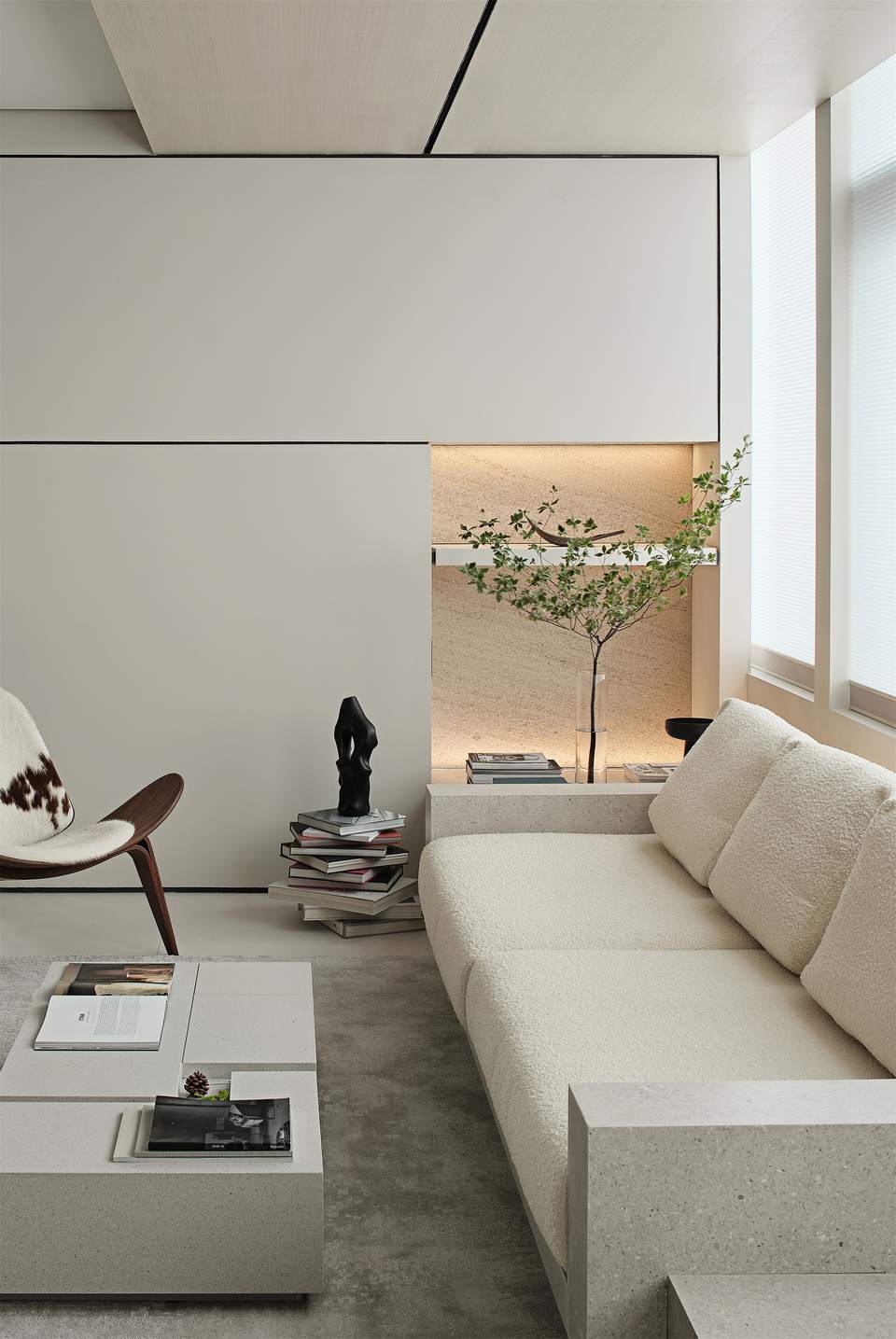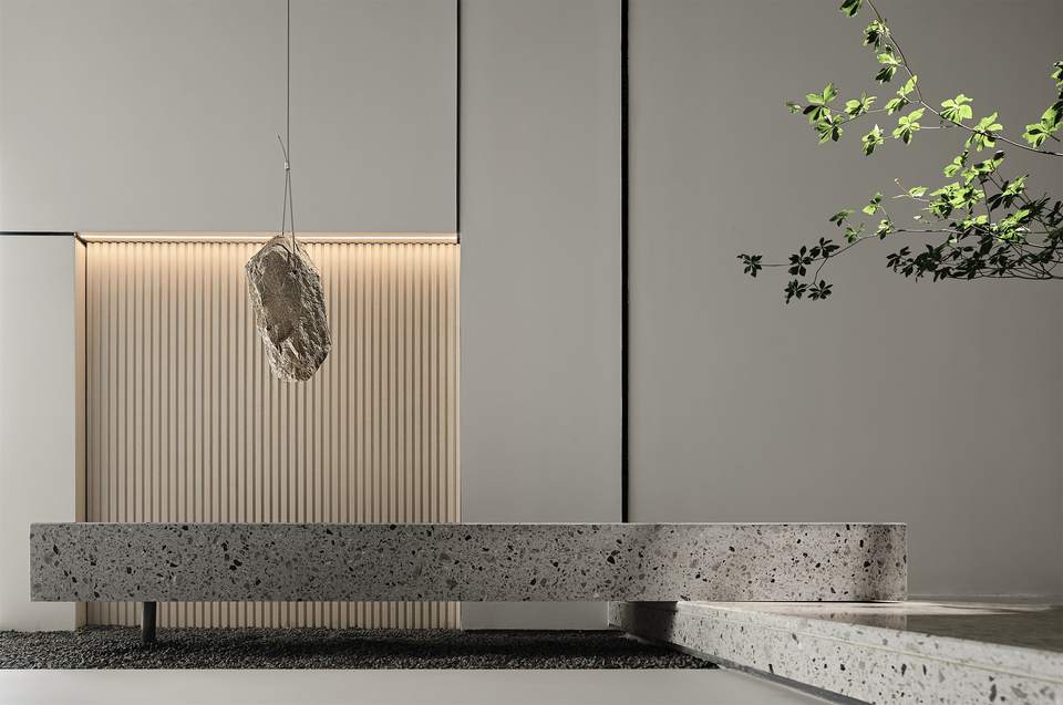 说到自然的形态,休闲区内的水吧台、茶几、沙发、桌子等都,来自于设计师本人单独设计定制的,大部分都使用了相同的岩板材质,以最贴合空间调性的形态存在于此,简单而清新,与空间的气质更加融合,更不会拘于各种形式。