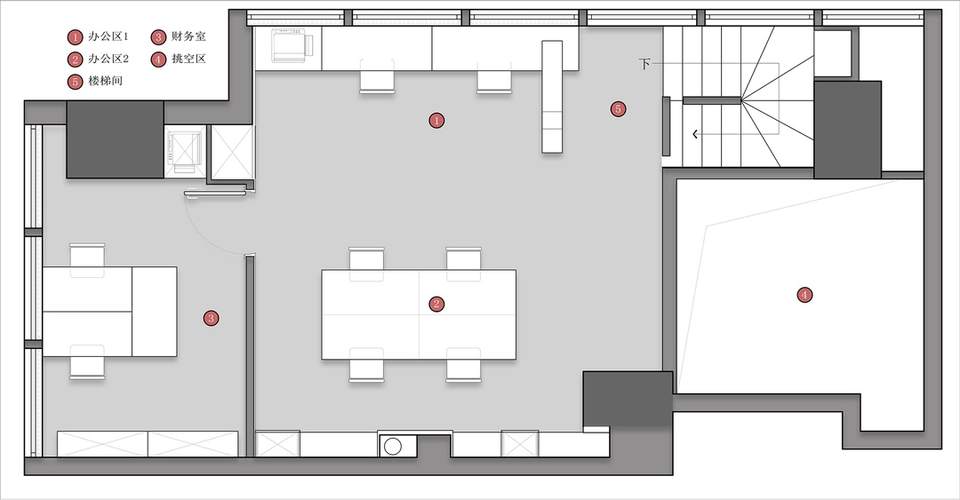 对于工业风格给人带来的:黑白灰、纯粹简明等。二层设计师办公室以现代工业风为基础,开放性布局之下,以简洁的块状隔墙代替裸露的砖墙,以红色的跳跃呈现空间的流动性。用最简单的方式抒写空间的形态美感与意境节奏,通过造景在办公中营构自然,增添一份舒适感,使设计师更好的高效进行工作。
