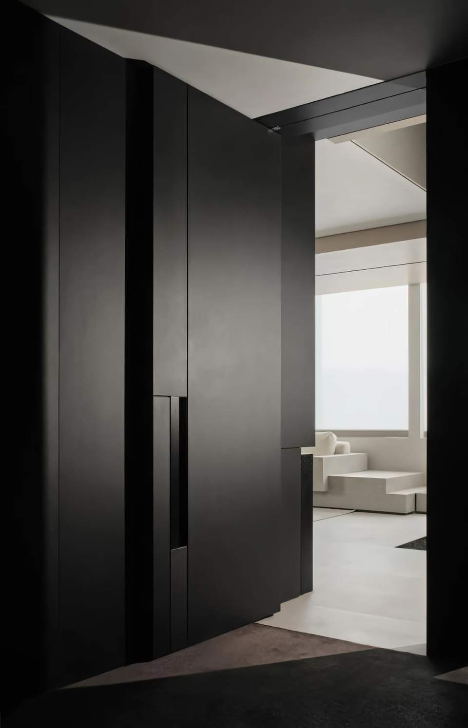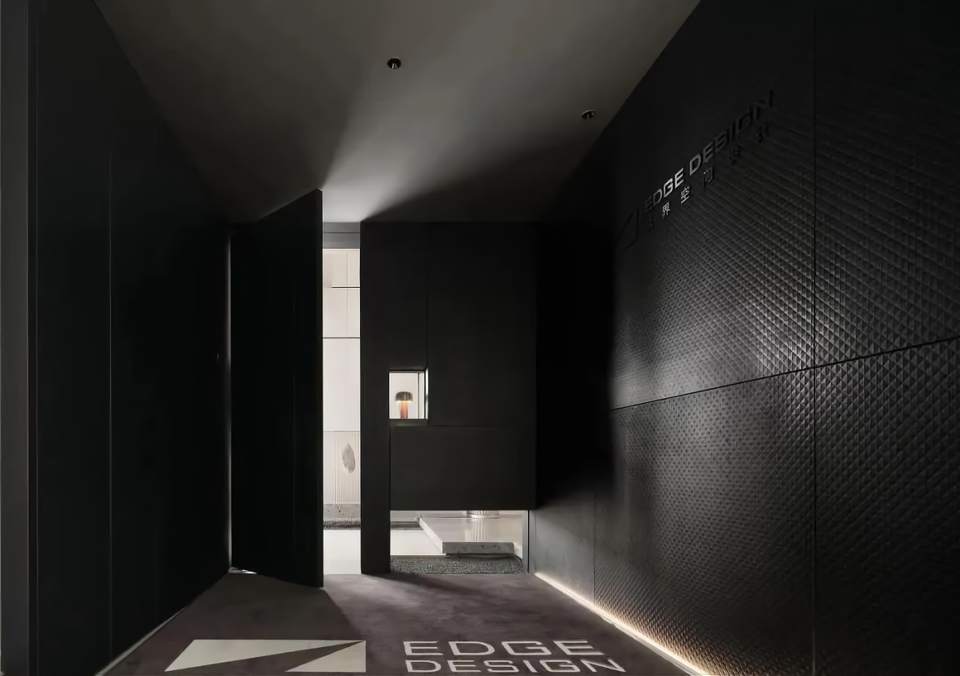 这是锐界空间设计的自用办公室,坐落于南京鼓楼区沿江繁华地段-苏宁慧谷,这里拥有着南京众多高层写字办公楼,聚集了各个领域的大小企业。办公室位置位于十六楼,当走到这个入口时,会发现并没有一览无余的透明玻璃门,只有那黑色包裹着神秘,透过切割黑色立体的洞口,从中窥探,发现这里与外面的世界形成了一道分界线,轨迹从这里开始蔓延,即刻开启神秘大门。