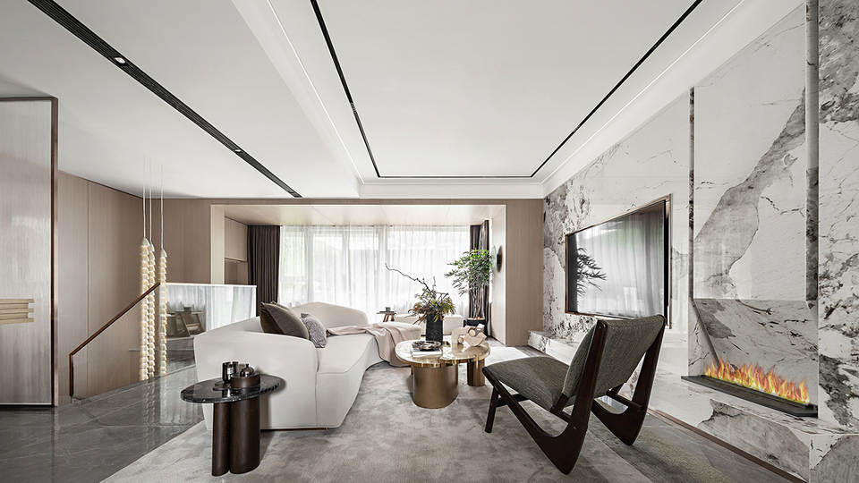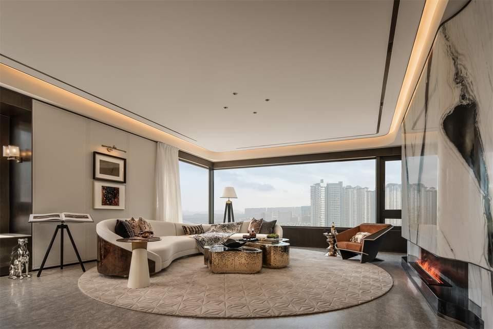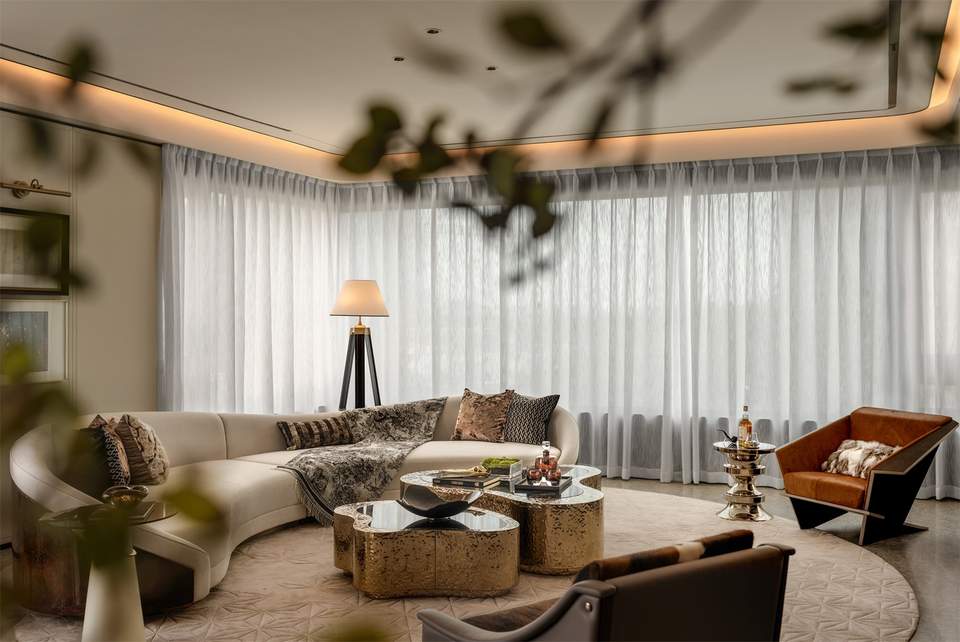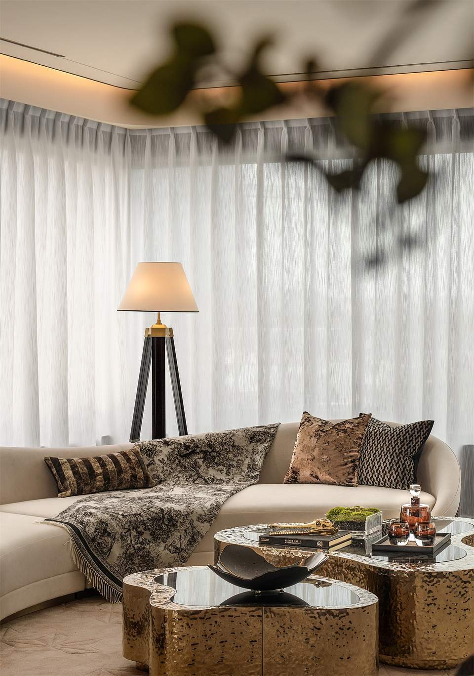 客厅的弧形沙发在开放式的大厅内自然地围塑出休闲区,视野开阔,活动自如。