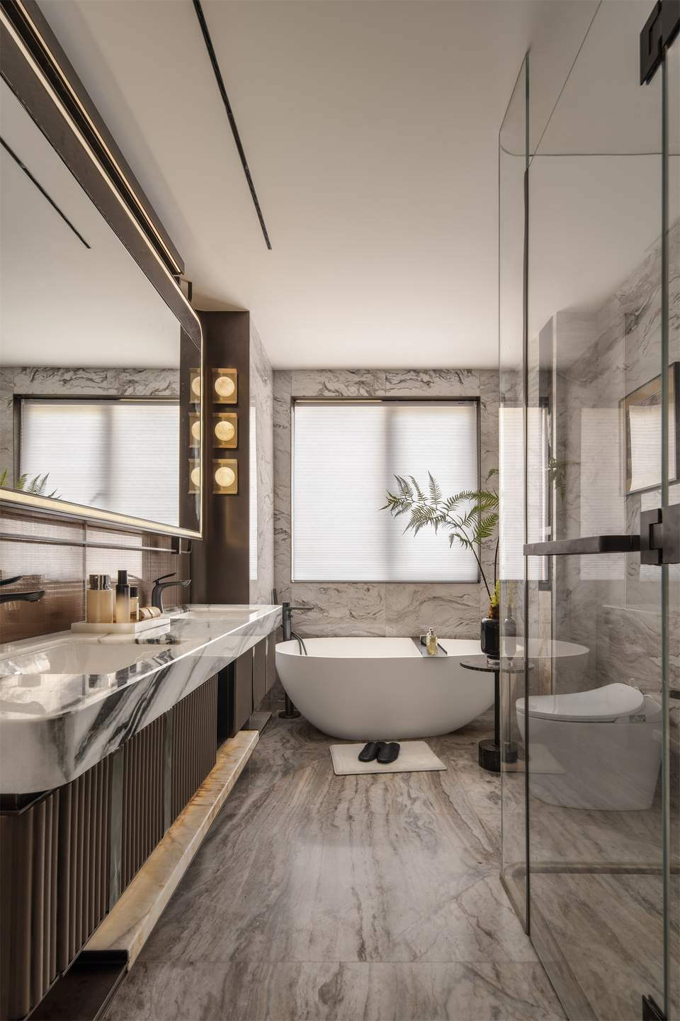 主卫天然石材的纹理与质感,尽显典雅与大方的气质。台盆等细节穿插了不同肌理的大理石,整体细节丰富,精致美观,卫浴间也来带来极致的品质。