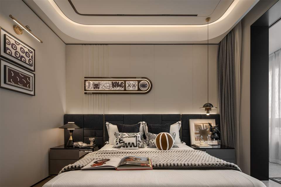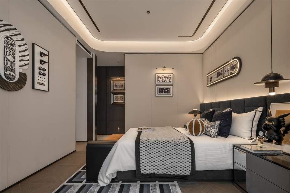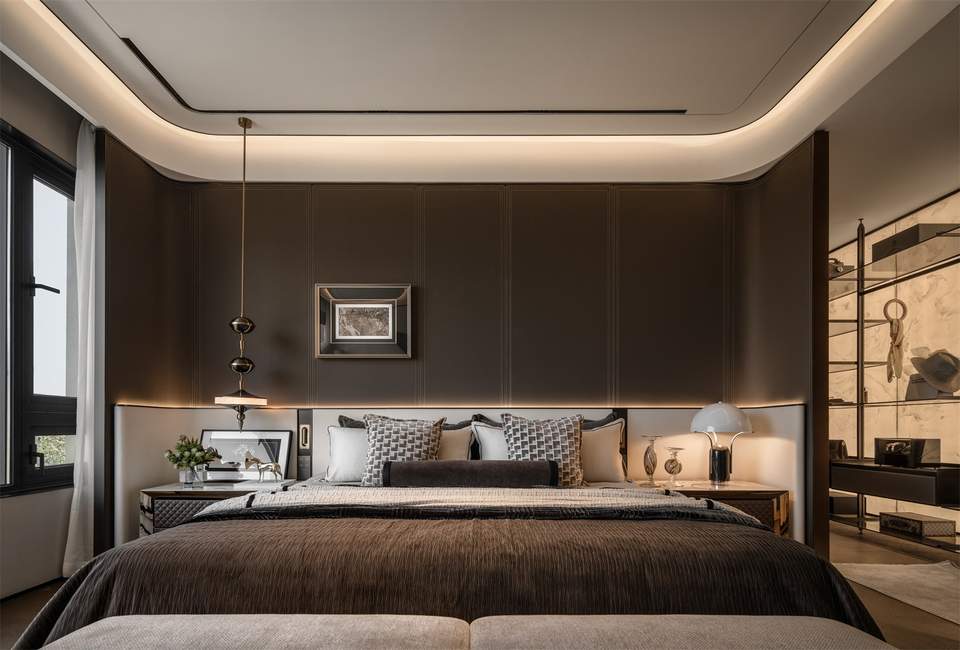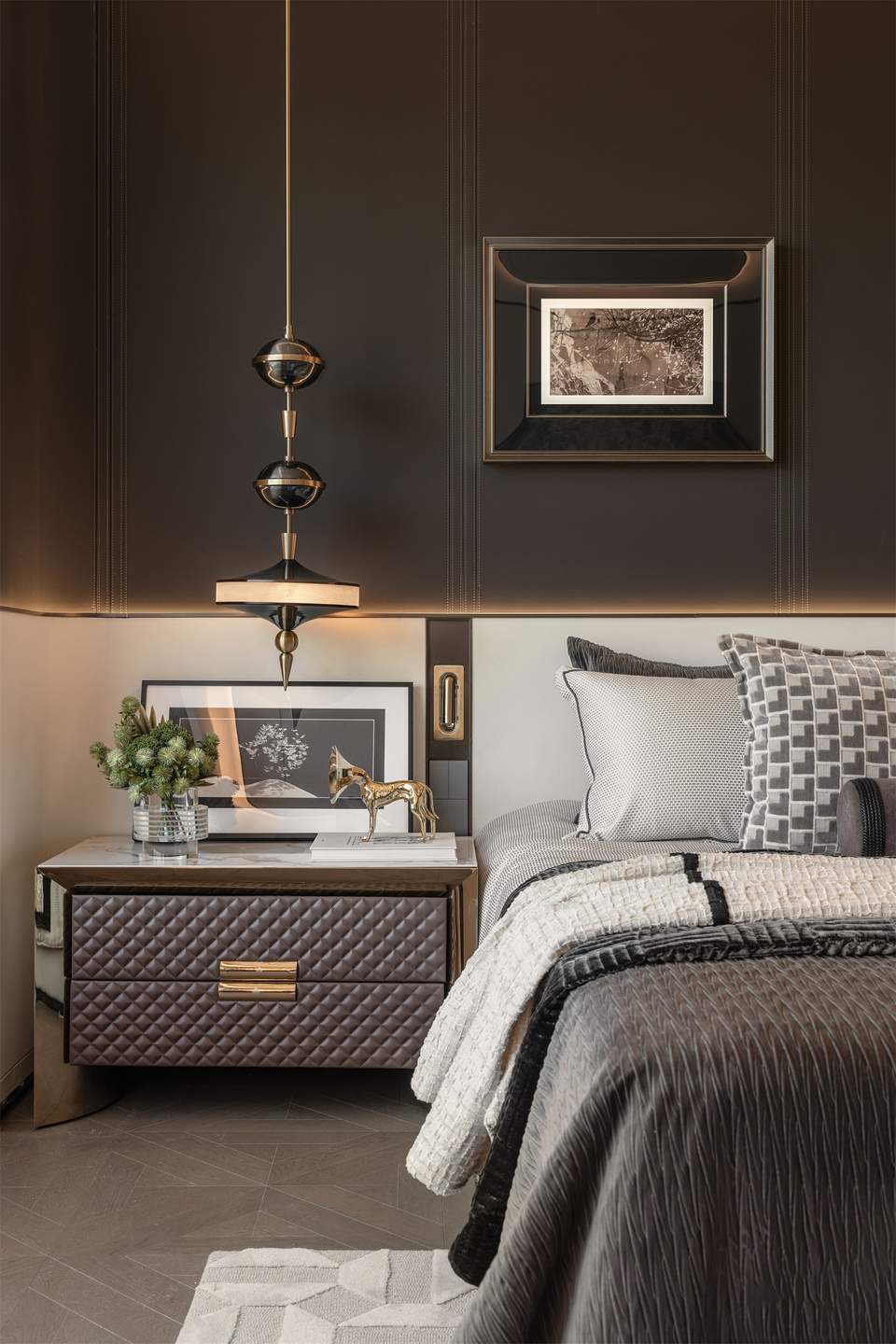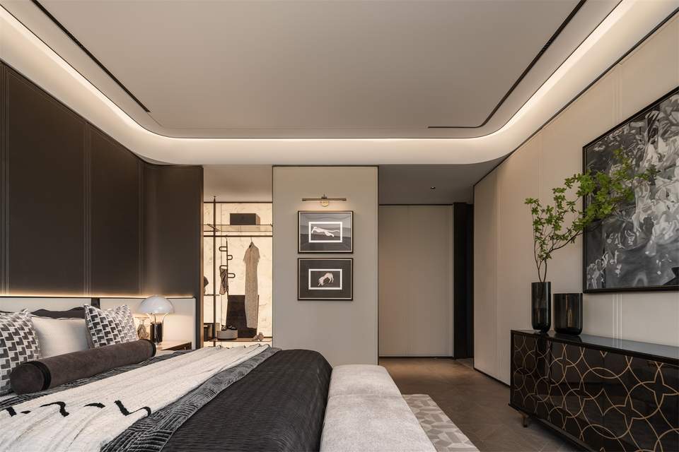 主卧套房超40㎡的奢阔尺度,可营造一个极致享受的卧室。背景墙以围合式造型构成亲密的包裹感,为休憩空间创造细腻温和的氛围。