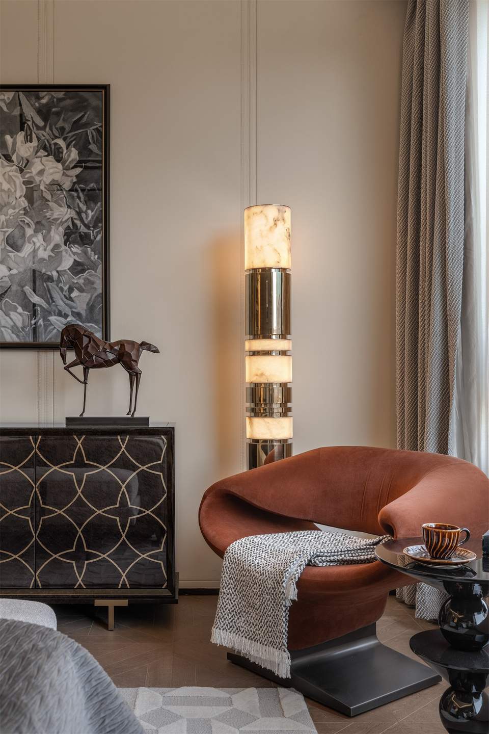 卧室的情景一角,摆上休闲沙发椅与落地灯,可阅读、独处,配合柔和的灯光,给予充分的放松情境。
