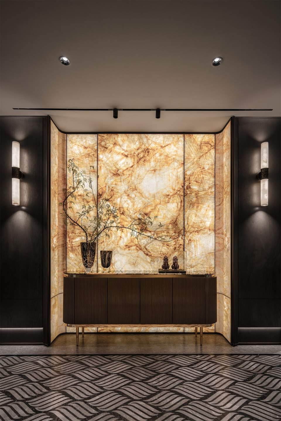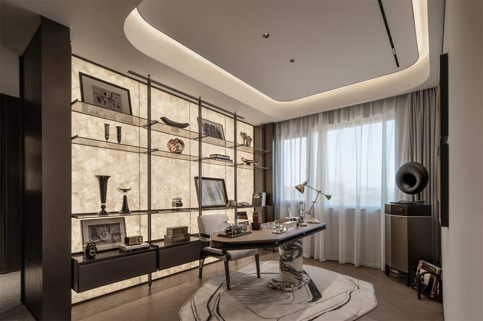 书房使用了珍贵材料白水晶透光石做背景,开放式陈列,展现出精致品位和层次。