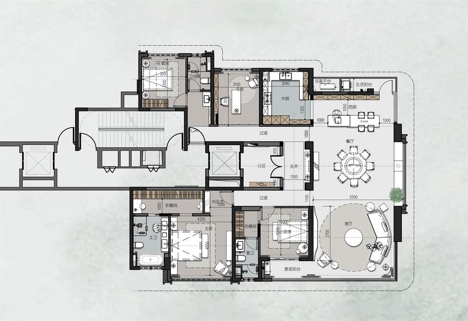 人们对客餐厅的要求越来越强调其功能性和体验性的优化,大平层给予了生活更大的互动尺度,可以在一个平层内实现多元场景化空间。