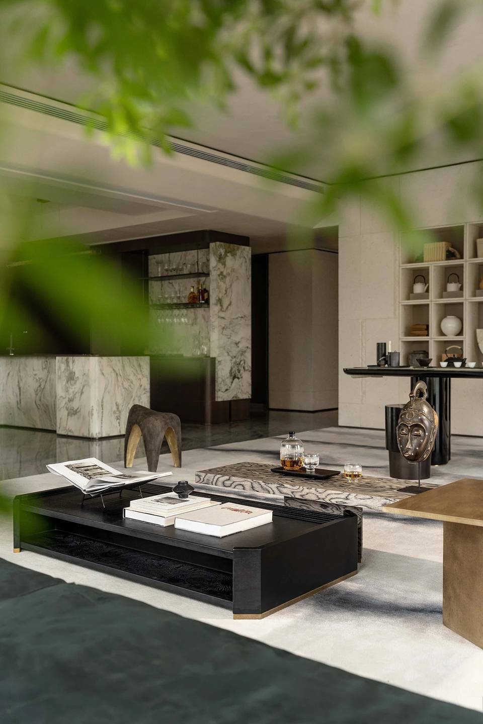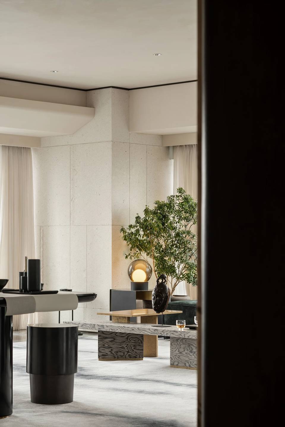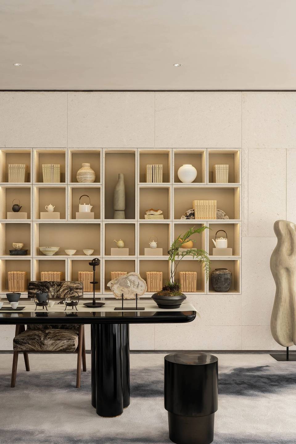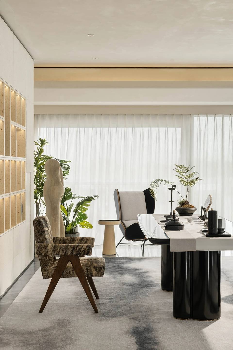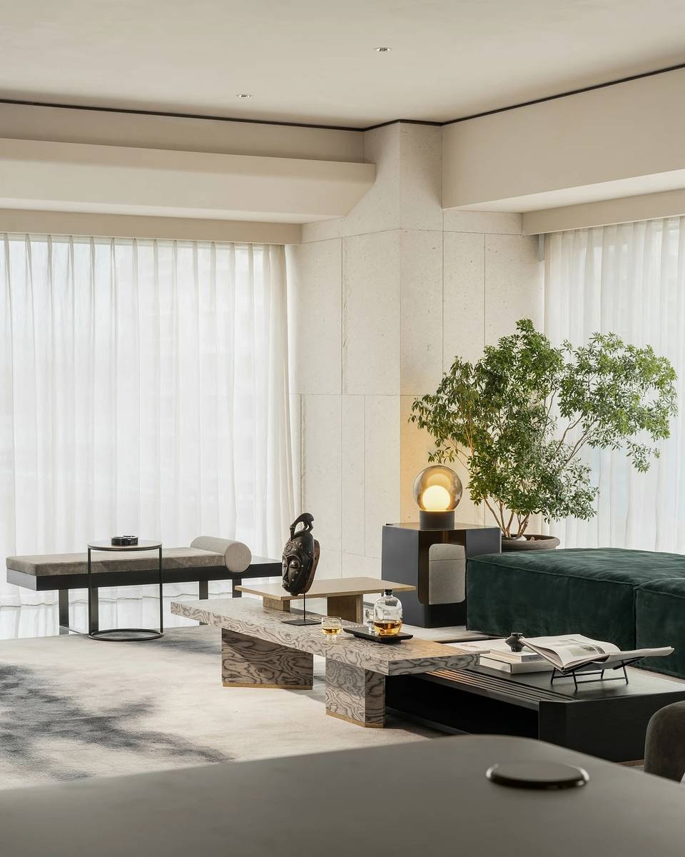 会客厅与茶室相连,既是空间,又是思想的场域。艺术家⽑冠帅的《缪斯》雕塑屹立其间,以流动交错的线条,探索居的精神性表达。其所带来的亲近感,在空间中力求释放一种情绪和能量场,柔软而充满温度。而未墨的沙发,为空间的精神性增添一份神秘的东方气质,是留白的沉着和对空间的强大包容力。