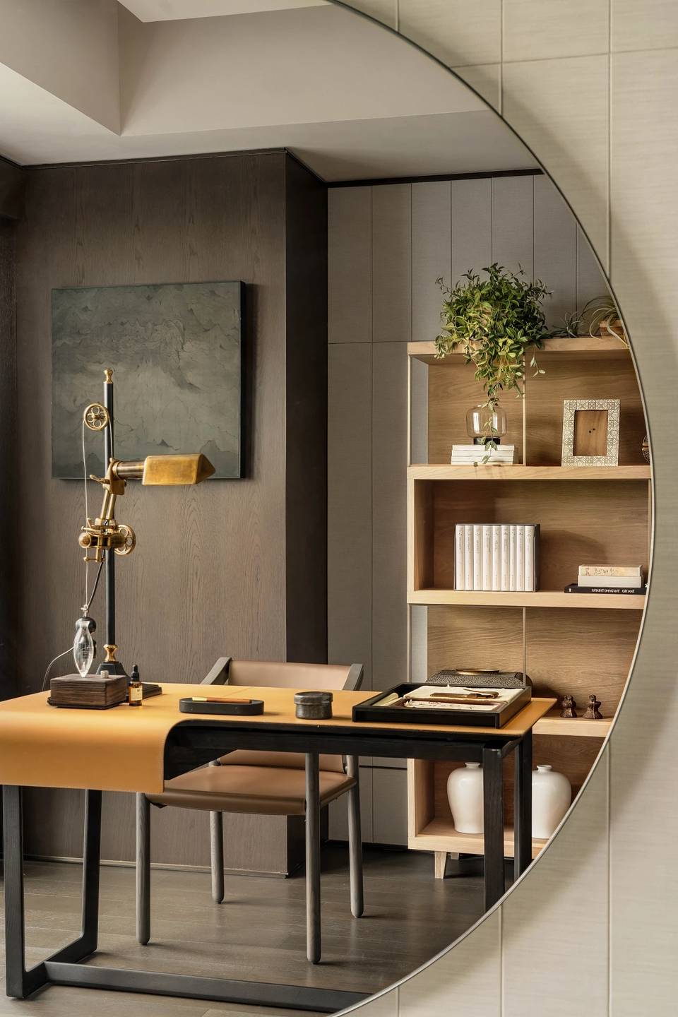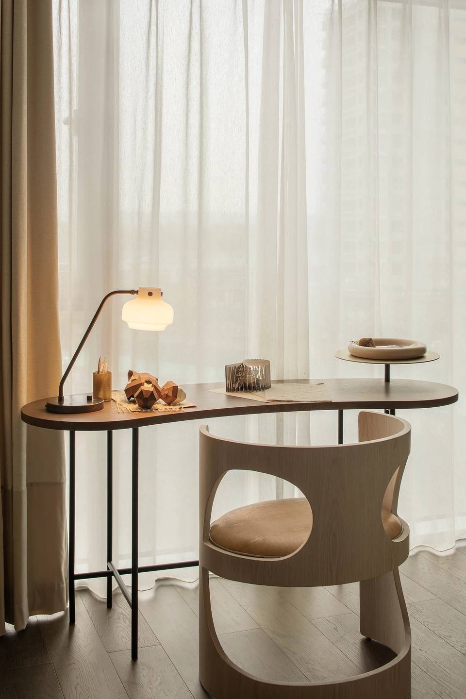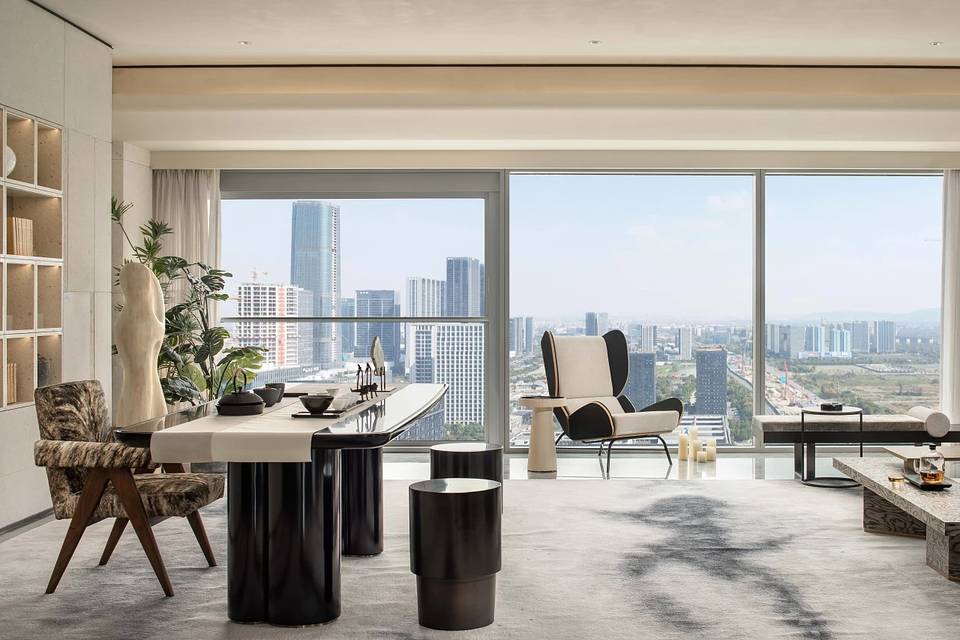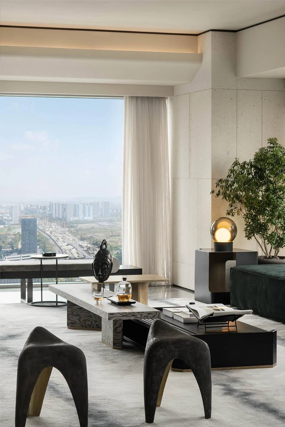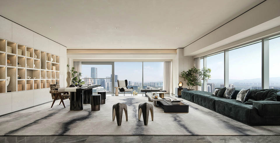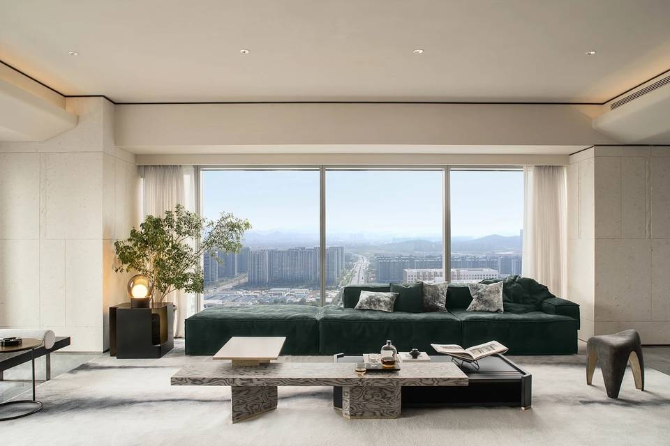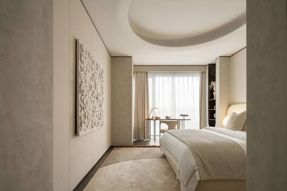 会客厅与茶室相连,既是空间,又是思想的场域。艺术家⽑冠帅的《缪斯》雕塑屹立其间,以流动交错的线条,探索居的精神性表达。其所带来的亲近感,在空间中力求释放一种情绪和能量场,柔软而充满温度。而未墨的沙发,为空间的精神性增添一份神秘的东方气质,是留白的沉着和对空间的强大包容力。