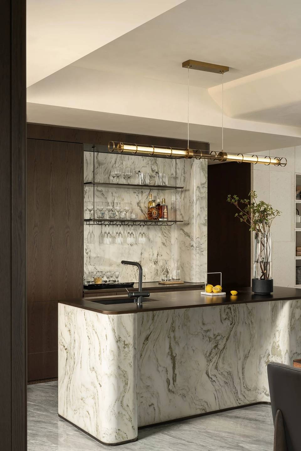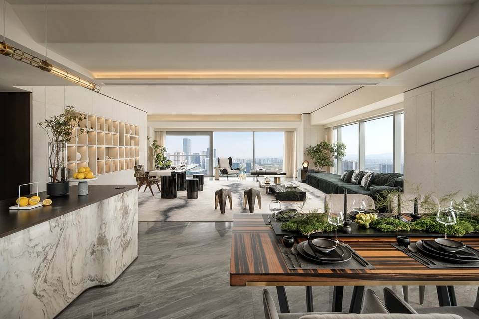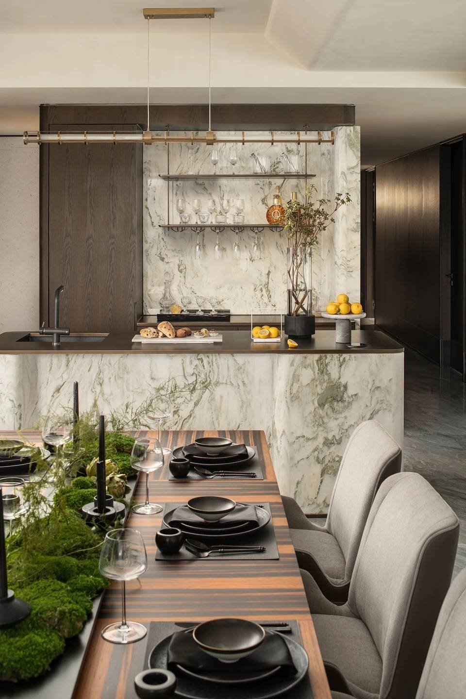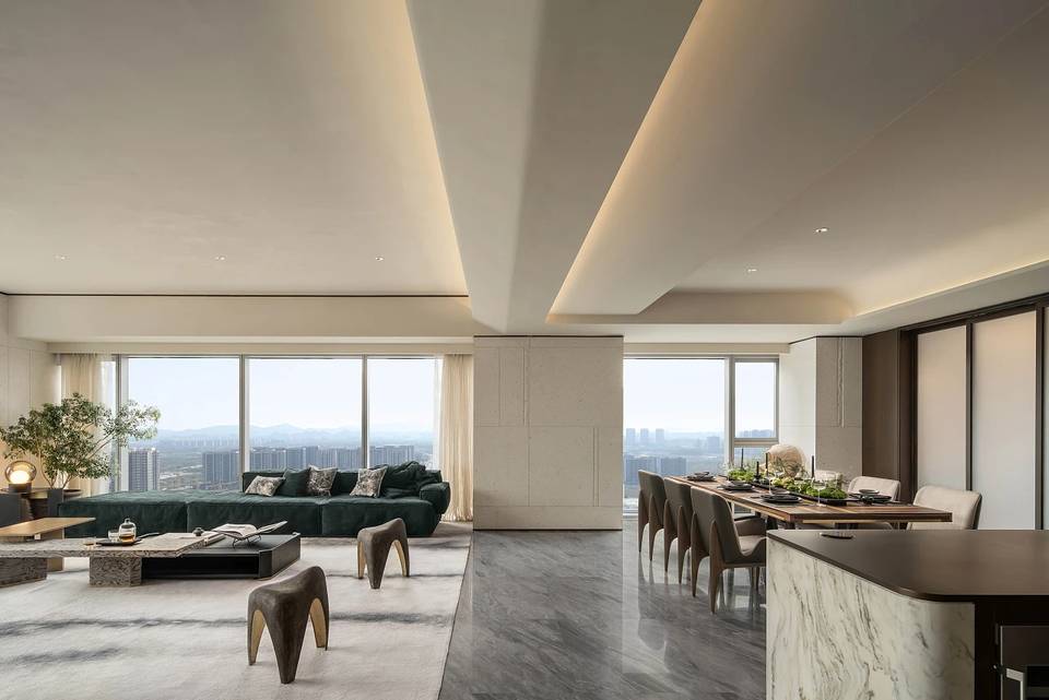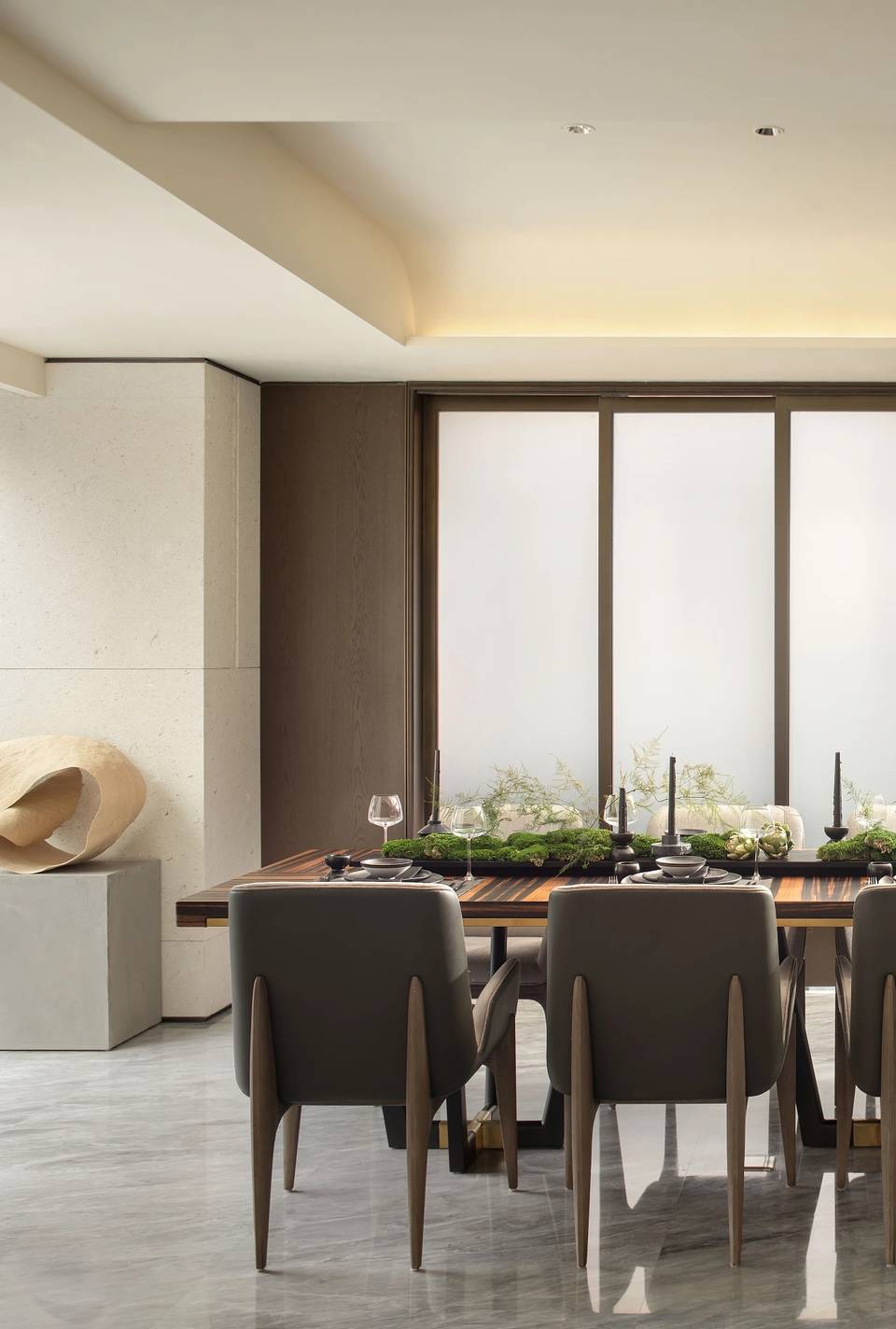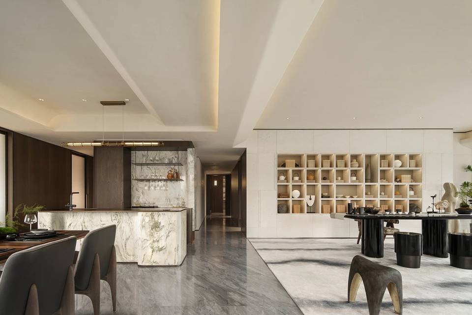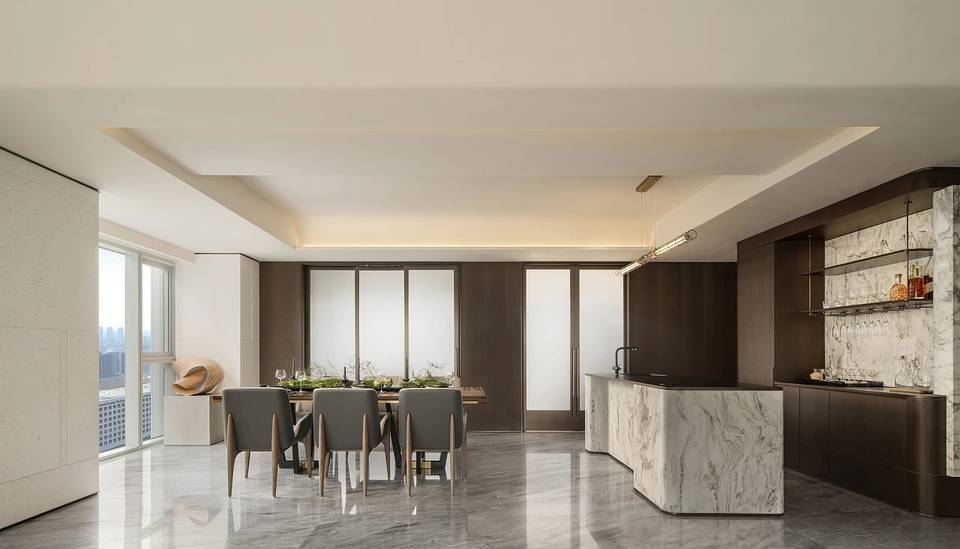 餐厅亦是一片开敞空间,墙面嵌套金属线与深色木饰面以及米色摩洛石面相交织,将自然的痕迹融入其中。
