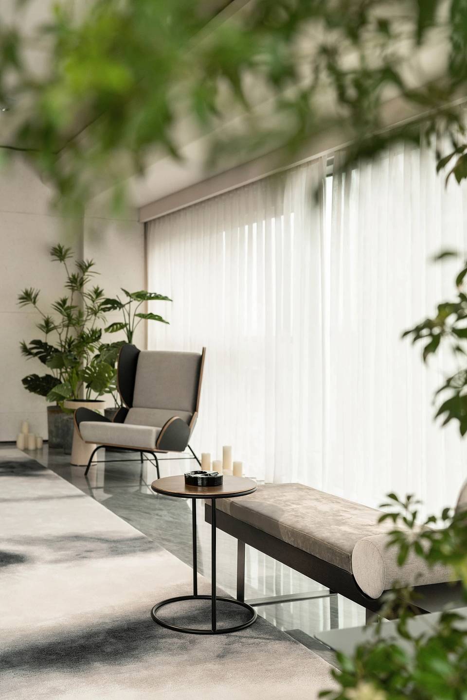 都市喧嚣中取静,在归途的过程中便得以实现情绪上的转换。潜意识引导下,从谧静而幽深的深色盒子进入序厅。温和的阳光透过浅色皮革所包裹的照壁,消除其隔离感的同时,将访客引入,去探访静谧的生活。穿梭于其间,每个场景都是生活方式的独特回应。
