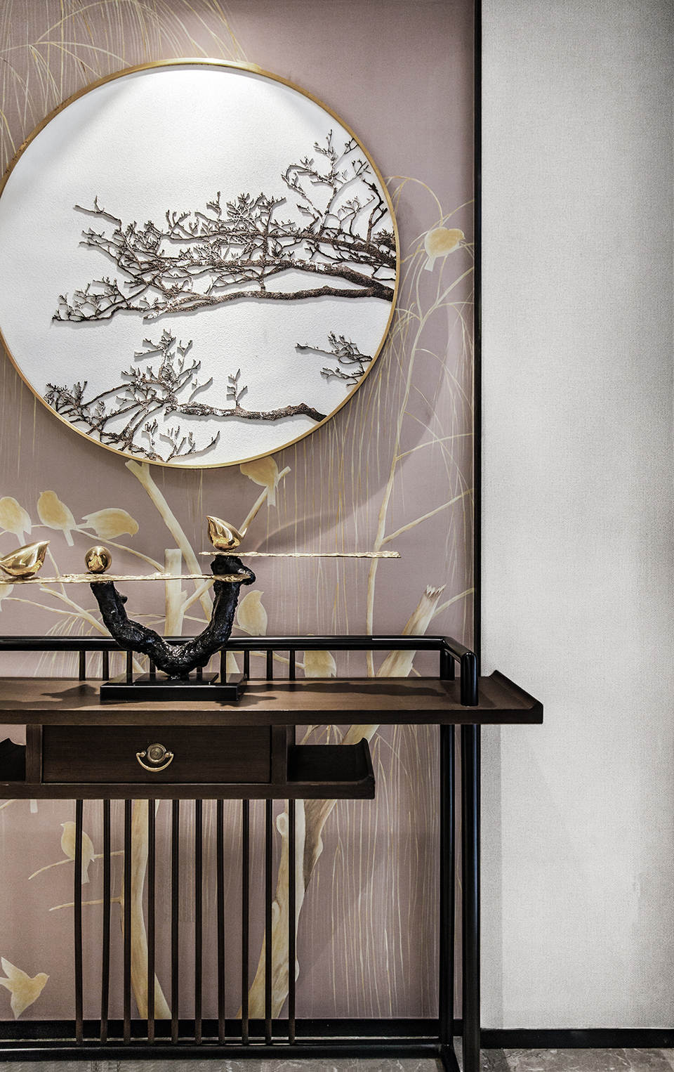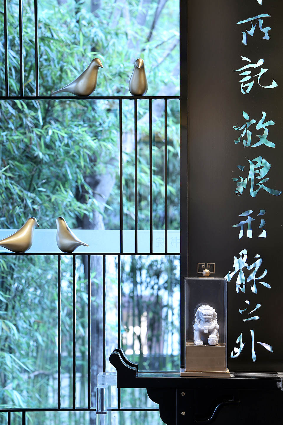 以王羲之的《兰亭序》书法片段作为镂刻端景,虚透竹影,引雀停留,意境悠长。