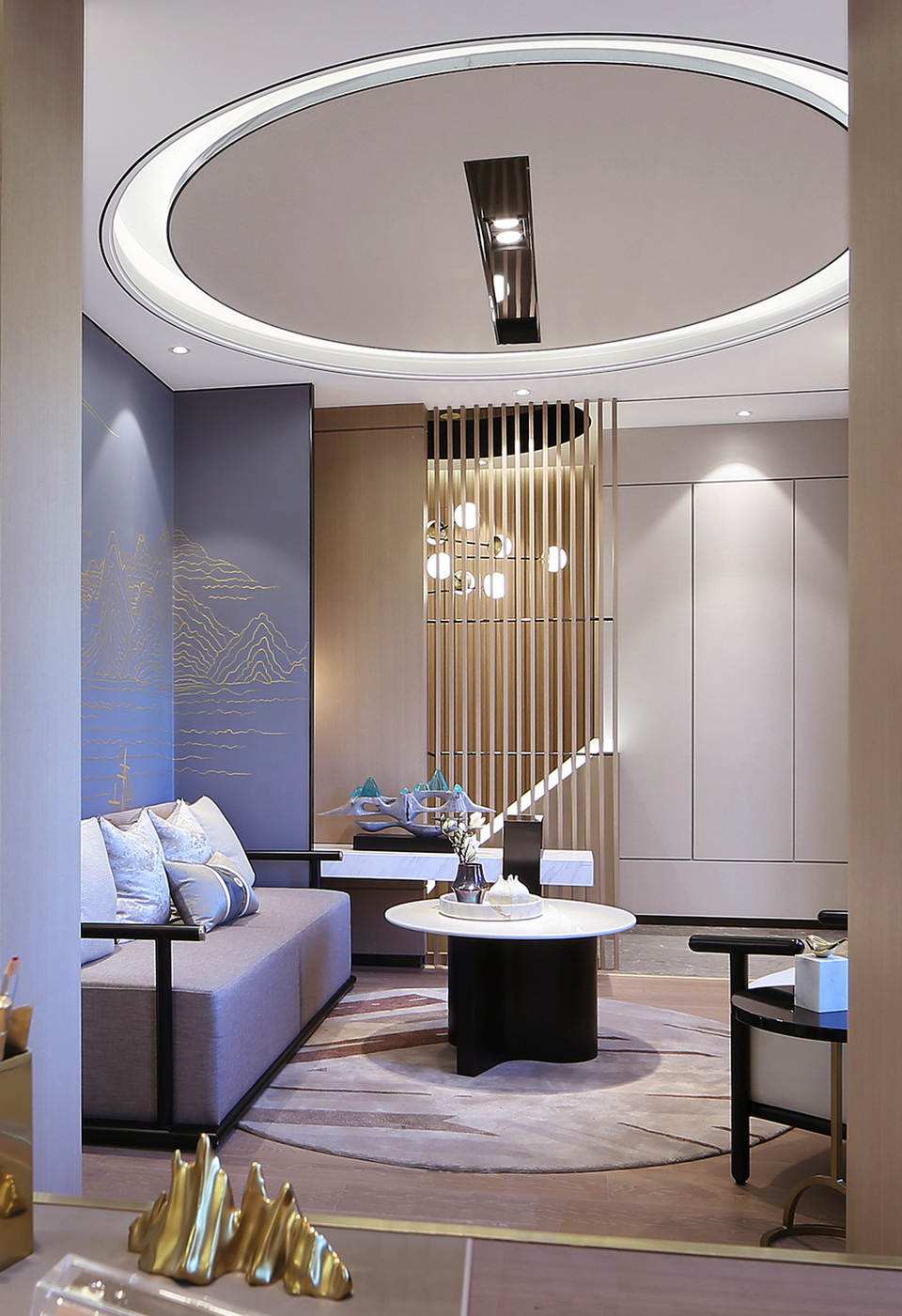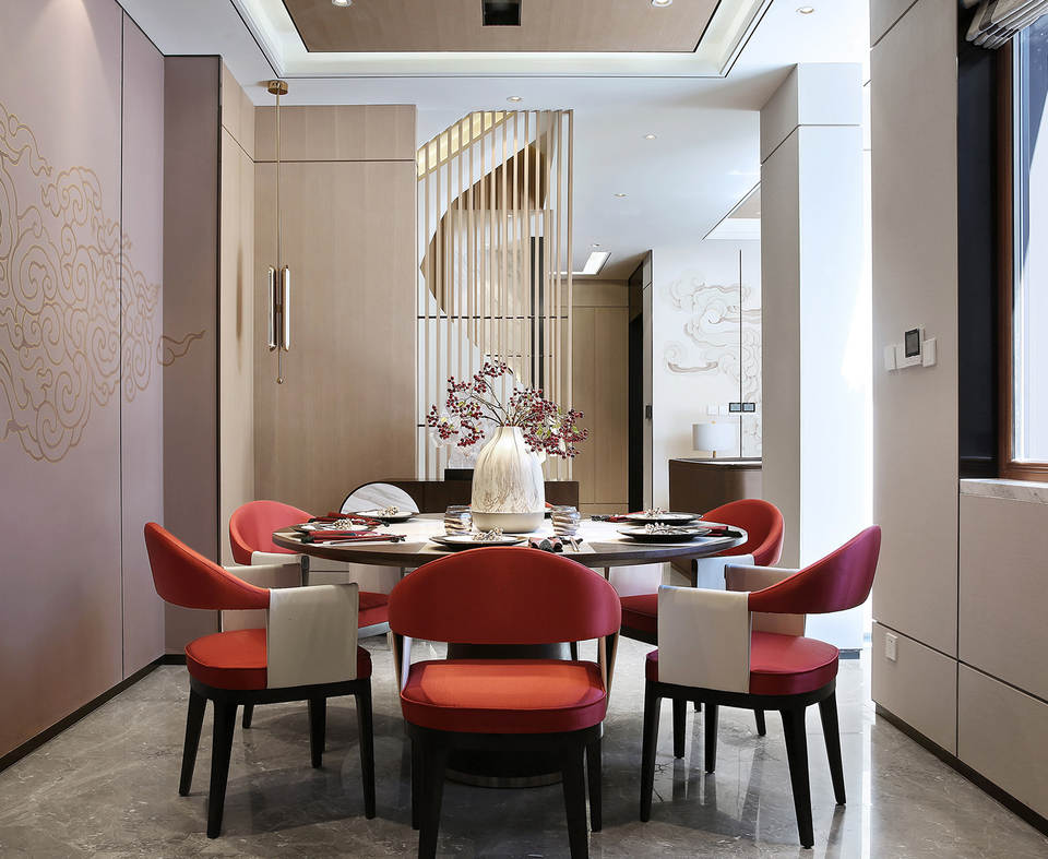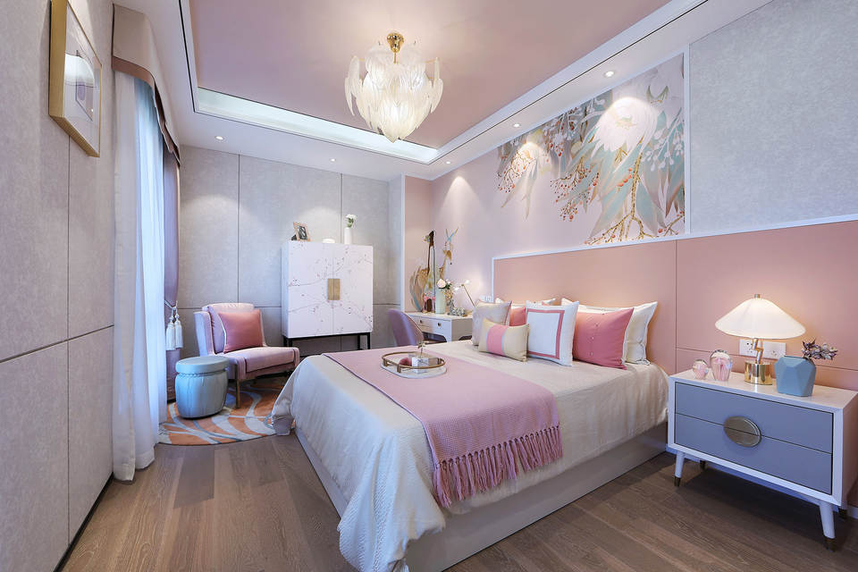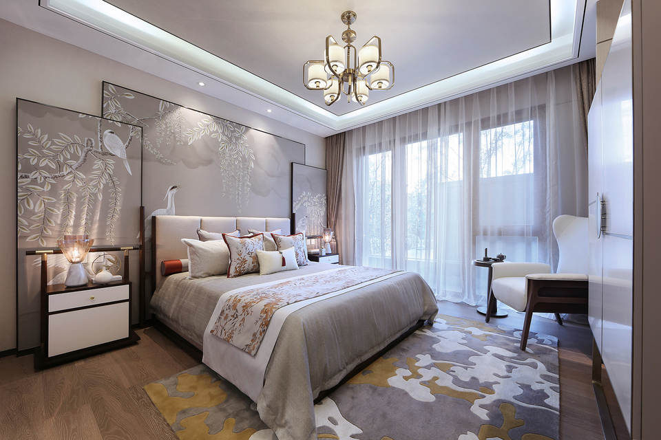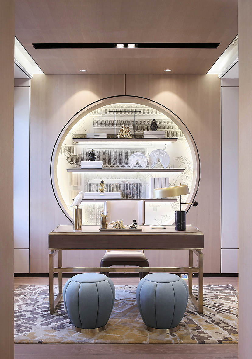 主人、老人、孩子,三代人各自的私属空间,设计采用半围合与高低错落的屏风式手绘背景,加强空间层次,表达不同的心属故事,展现出祥和、恬美和静思的意念。