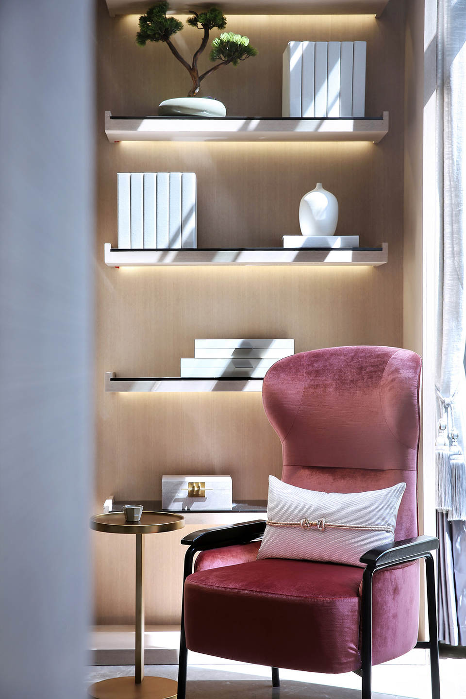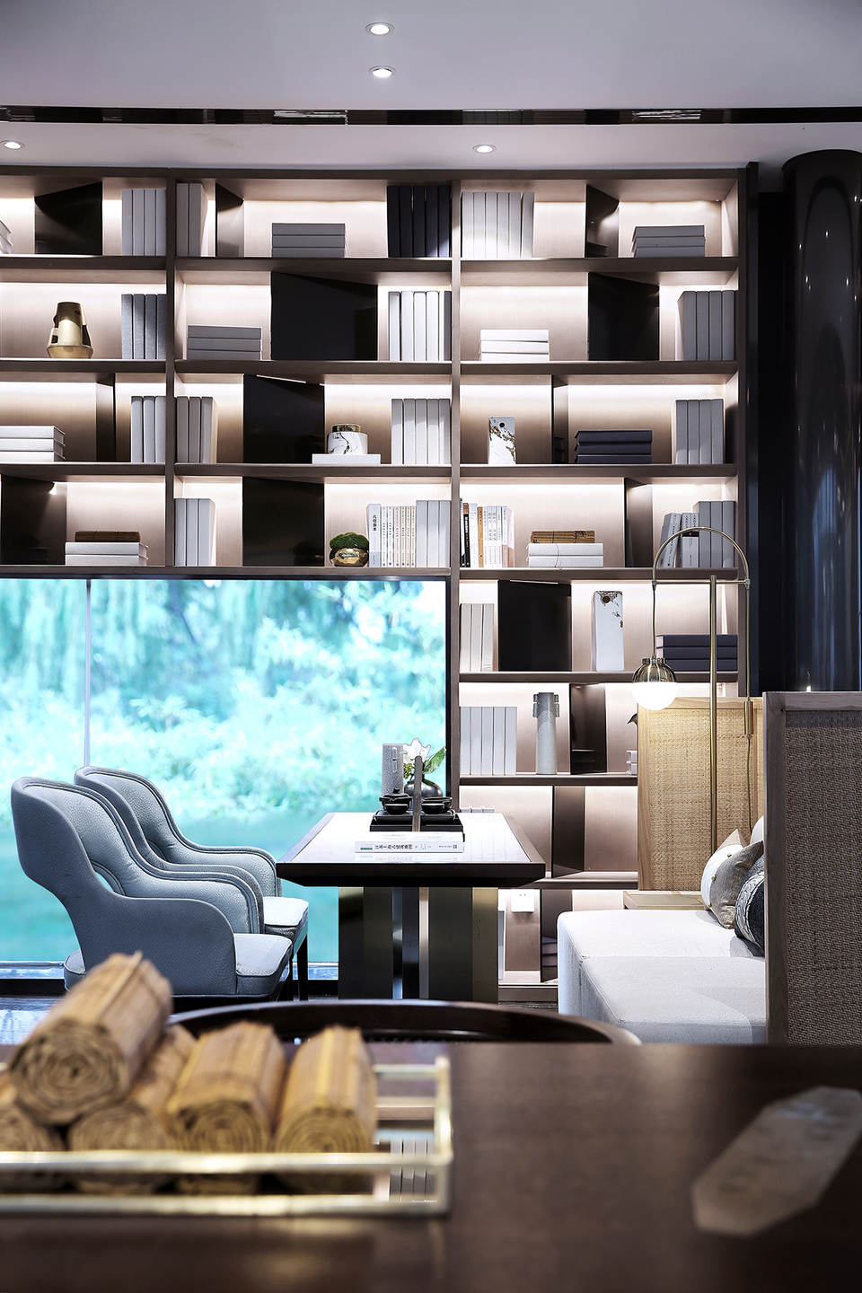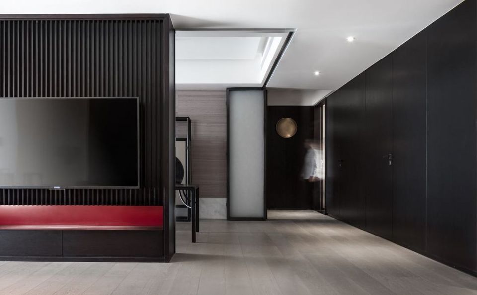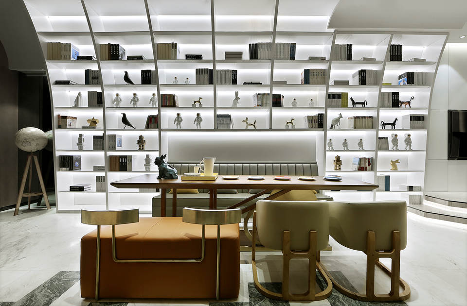 空间施以干净纯粹的环境底色,时而跳跃出一抹鲜色以加强空间张力。延墙一排高耸入顶的书架给人一种严谨而不失趣味的学院感。
